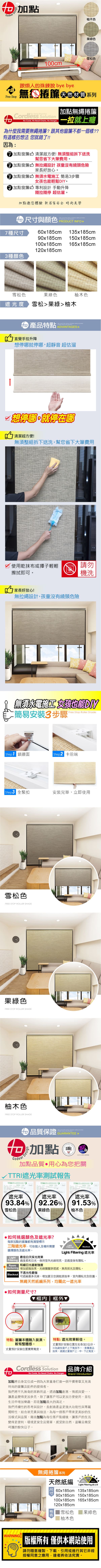 【注意事項】1.商品展示圖因每台電腦螢幕設定差異顏色會略有不同,以實際商品顏色為準2.請勿洗滌本產品3.請按照包裝內說明書步驟進行安裝4.窗簾本體清潔請用滾筒式黏把或乾布輕輕擦拭5.窗簾請按照說明書規範使用,切勿自行改裝6.建議使用年限約5–10年(依使用環境及保養方式而定)