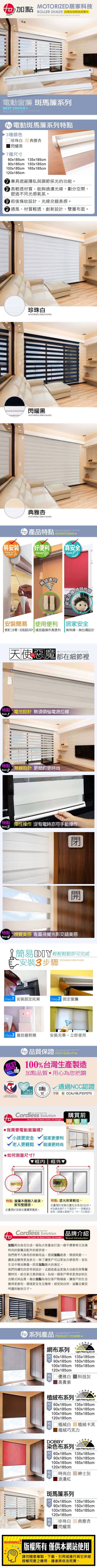 【商品規格】商品名稱:加點 台灣製 DIY 電動窗簾 斑馬簾系列窗簾本體材質:鐵、鋁、POM、POLY窗簾本體顏色:珍珠白、典雅杏、閃耀黑窗簾本體規格(全展開):(W)100公分X(H)185公分X(D)5.5公分窗簾本體規格(全收起):(W)100公分X(H)9公分X(D)5.5公分窗簾本體重量:1691公克窗簾本體產地:台灣接收器材質:ABS、POM、電子元件接收器規格:(W)52X(H)18X(D)97mm接收器重量:43公克接收器電源:DC 3V(3號電池X2)、未附贈電池,建議使用鹼性電池接收器產地:台灣接收距離:約6~8公尺接收器功能:接收遙控器訊號,操作馬達作動NCC管制編號:CCAJ16LP3370T0遙控器材質:ABS、電子元件遙控器規格:(W)43X(H)16X(D)128.5MM遙控器重量:31公克遙控器電源:DC 3V(4號電池X2)、未附贈電池,建議使用鹼性電池遙控器產地:台灣遙控距離:約6~8公尺遙控器功能:控制接收器,馬達作動【商品特色】● 斑馬紋設計:遙控調節隱私與採光● 輕量通風:高輕透材質,通風度高● 視覺美感:專屬視覺光影交錯美感● 簡單操作:上下鍵遙控窗簾升降● 居家安全:無珠鍊避免兒童繞頸● 安裝簡易:附安裝配件輕鬆DIY● 電池設計:免去額外電源配線● 彈性操作:無電池亦可手動操作【注意事項】● 請按照包裝內說明書步驟進行安裝。● 窗簾本體清潔請用滾筒式黏把或乾布輕輕擦拭。● 窗簾電源請按照說明書規範使用,切勿自行改裝。● 建議使用年限約5–10年(依使用環境及保養方式而定)。