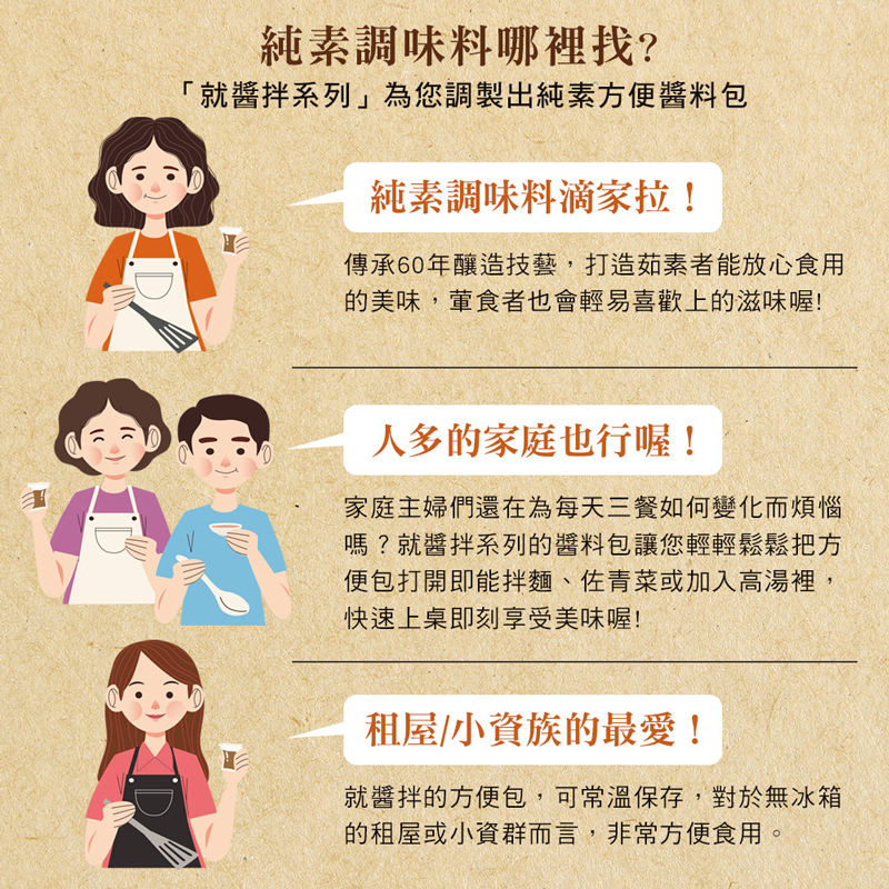 #全素#醬料包#佐餐#料理#拌麵#調味【 就醬拌,伴你度過每一餐 】就醬拌方便包使用各式香料,堆疊出富有層次的飲食特色,就算以簡單的烹煮方式調理,一樣可以變化出色、香、味俱全的美味料理。嚴選食材,打造茹素者可放心食用的純素醬料,無論是拌麵、拌菜,或是加入湯裡作為調味都合適,葷食者也能夠輕鬆入門喔! 陪伴你輕鬆完成料理,餐桌菜餚不再一成不變!就醬拌系列方便包,是你的最佳方便快速料理神隊友! 【 椒麻醬方便包 】以非基改「純釀醬油」為基底,搭配上微辣的「花椒紅油」,打造出兼具醬油甘醇醬香及椒麻誘人辛香,多重味蕾體驗的菜餚良伴,適量添加除了為食材提鮮,更可刺激萎靡的胃口,提振食慾,是一款令人回味無窮、餘韻連綿的拌醬。● 純釀手工、非基因改造醬油● 誘人辛香的花椒紅油● 花椒香氣足 麻辣指數一顆星● 適合不敢吃太辣又想要有點辣的你原料:純釀造醬油、黃豆油、水、糖、鹽、調味劑(5’一次黃嘌呤核苷磷酸二鈉、5’一次鳥嘌呤核苷磷酸二鈉)、混合濃縮生育醇(抗氧化劑)、辣椒萃取物、花椒萃取物、香辣紅油。內容量:28g/包(共 8 包)有效期限:印於袋上保存期限:兩年■ 廠商名稱 : 好健康國際有限公司■ 廠商電話 : 02-26755234■ 廠商地址 : 238新北市樹林區千歲街57-7號1樓■ 投保產品責任險字號 : 0525字第23AML0004952-2號■ 食品業者登錄字號 : H-153997270-00000-7