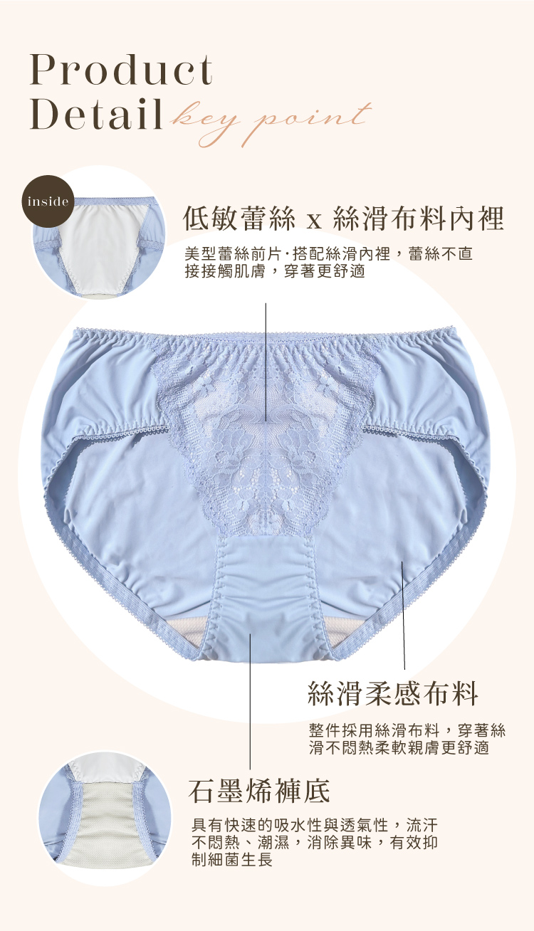 【Clany可蘭霓】澎然心動 石墨烯抑菌透氣蕾絲 M-XL 中腰內褲 晴空藍 3063-51