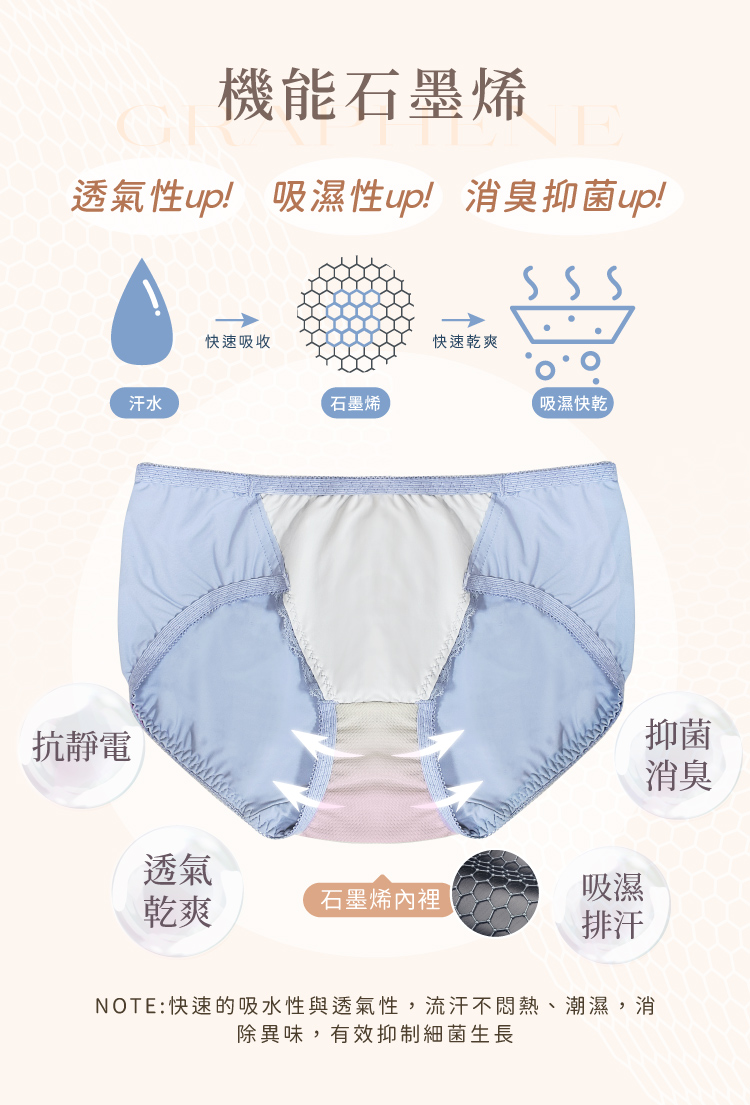 石墨烯抑菌褲底 — 有效抑菌、吸濕透氣,流汗不悶不尷尬,拒絕異味!