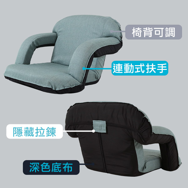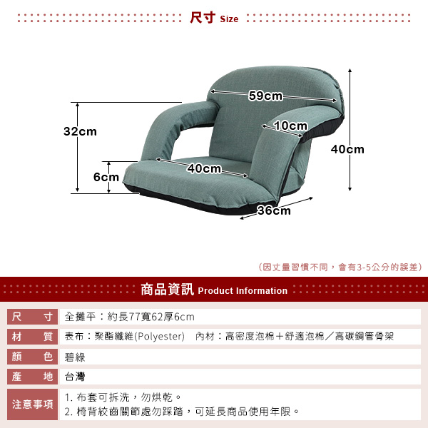 #台灣製 #可拆洗 #扶手椅 #和室椅《 商品特色 》 ●外銷等級專利絞齒,耐用安全 ●連動式扶手 ●椅背可調整 ●攤平收納不佔空間 ●台灣製造《商品資訊 》★尺寸★-攤平-長77㎝×寬62㎝×厚6㎝-和室椅-(椅背) 背寬59㎝×背高40㎝(椅坐) 坐寬59㎝(含扶手)/40cm(不含扶手)×坐深36㎝(扶手) 寬10㎝/高32㎝(椅背全立起狀態)(以上規格為人工丈量會有微誤差約±2cm內)★重量★約5kg(以上重量為人工丈量會有微誤差約±1-2kg內)★材質★(表布)聚酯纖維(Polyester)(內材)舒適泡棉+高密度聚合棉/高碳鋼管骨架★顏色★碧綠★產地★台灣/台南市 ※小叮嚀※1.布套可拆洗,勿烘乾2.椅背絞齒關節處請勿踩踏,可延長商品使用年限【關於運費】