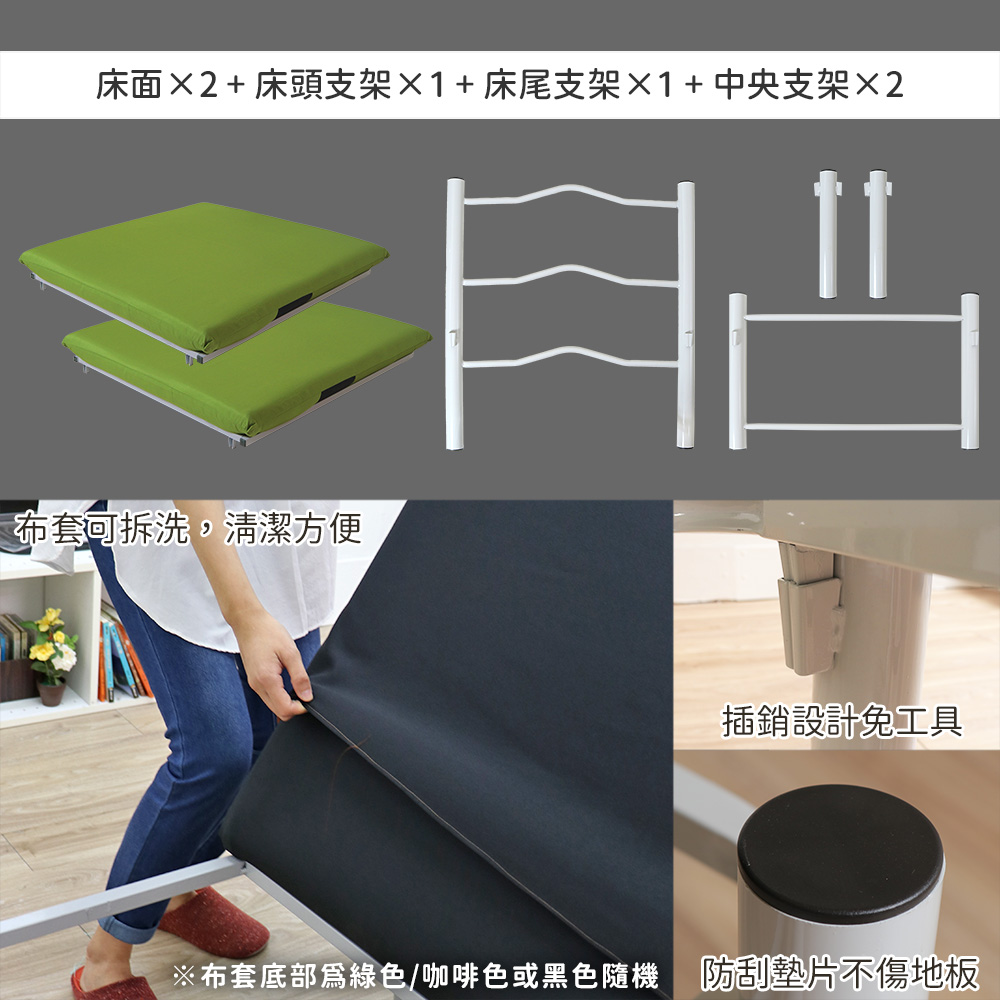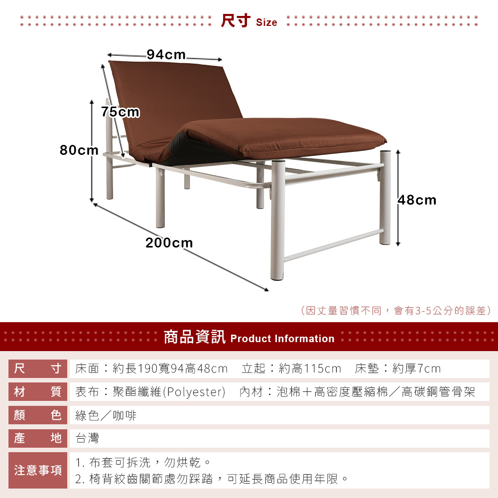 ◆商品特色:(1) 台灣製造(2) 插銷設計組裝簡單(3) 拆洗方便(4) 加高設計(5) 床面角度可調◆商品資訊: 尺寸: 長190㎝×寬94㎝×高48㎝床頭立起高約115cm床墊厚度約7cm(以上規格為人工丈量會有微誤差約正負2公分內)重量:約30㎏(人工丈量會有微誤差約正負1公斤內)材質:(表布) 聚酯纖維(Polyester)(內材) 高密度聚合棉+泡棉顏色:咖啡/綠色產地:台灣/台南市◆小叮嚀:1. 表布可拆洗,勿烘乾2. 另外搭配床墊並且避免踩踏絞齒處,可延長使用期限 ※其他特殊注意事項: