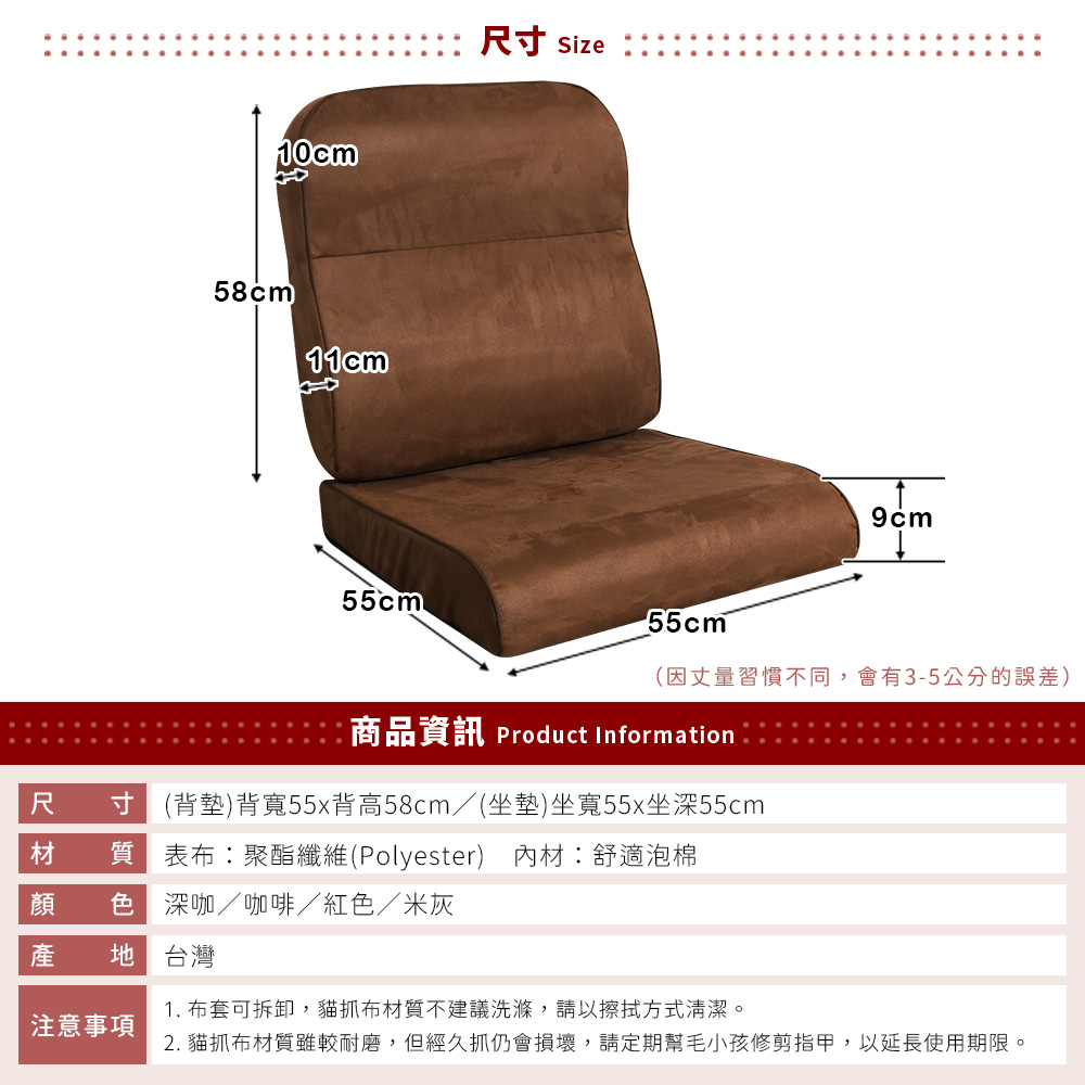 《 商品特色 》● 耐磨耐刮貓抓布● 採用高密度泡棉,更輕,耐久坐● 全開式拉鍊設計,布套可拆洗● 附綁帶,可固定在椅背上● 適用木椅、和室坐墊● 椅背、椅坐可拆開使用● 坐墊/沙發墊首選● 台灣製造《 商品資訊 》★尺寸★(攤平) 長約 127cm*寬約 55cm*厚約 11cm(背墊)高約 58cm*寬約 55cm(坐墊)深約 55cm*寬約 55cm(以上規格為人工丈量會有微誤差約±2cm內)★材質★表布:聚酯纖維((polyester))內材:舒適泡棉 ★顏色★深咖/咖啡/紅色/米灰★產地★台灣/台南市 ※小叮嚀※1. 布套可拆卸,貓抓布材質不建議洗滌,請使用擦拭方式清潔2. 貓抓布材質雖較耐磨,但經久抓仍會損壞,請定期幫毛小孩修剪指甲,以延長使用期限。※其他特殊注意事項: