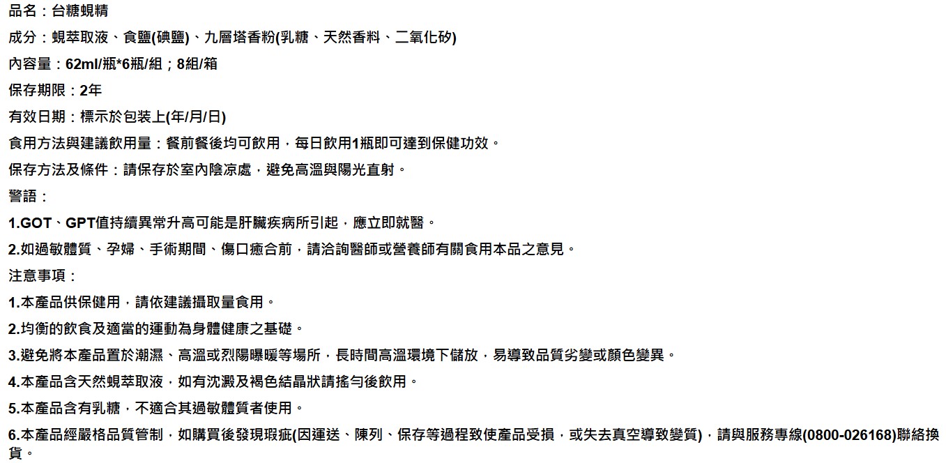 ◎品牌:台糖 ◎規格: 62ml毫升 x 6 x 1Box盒
