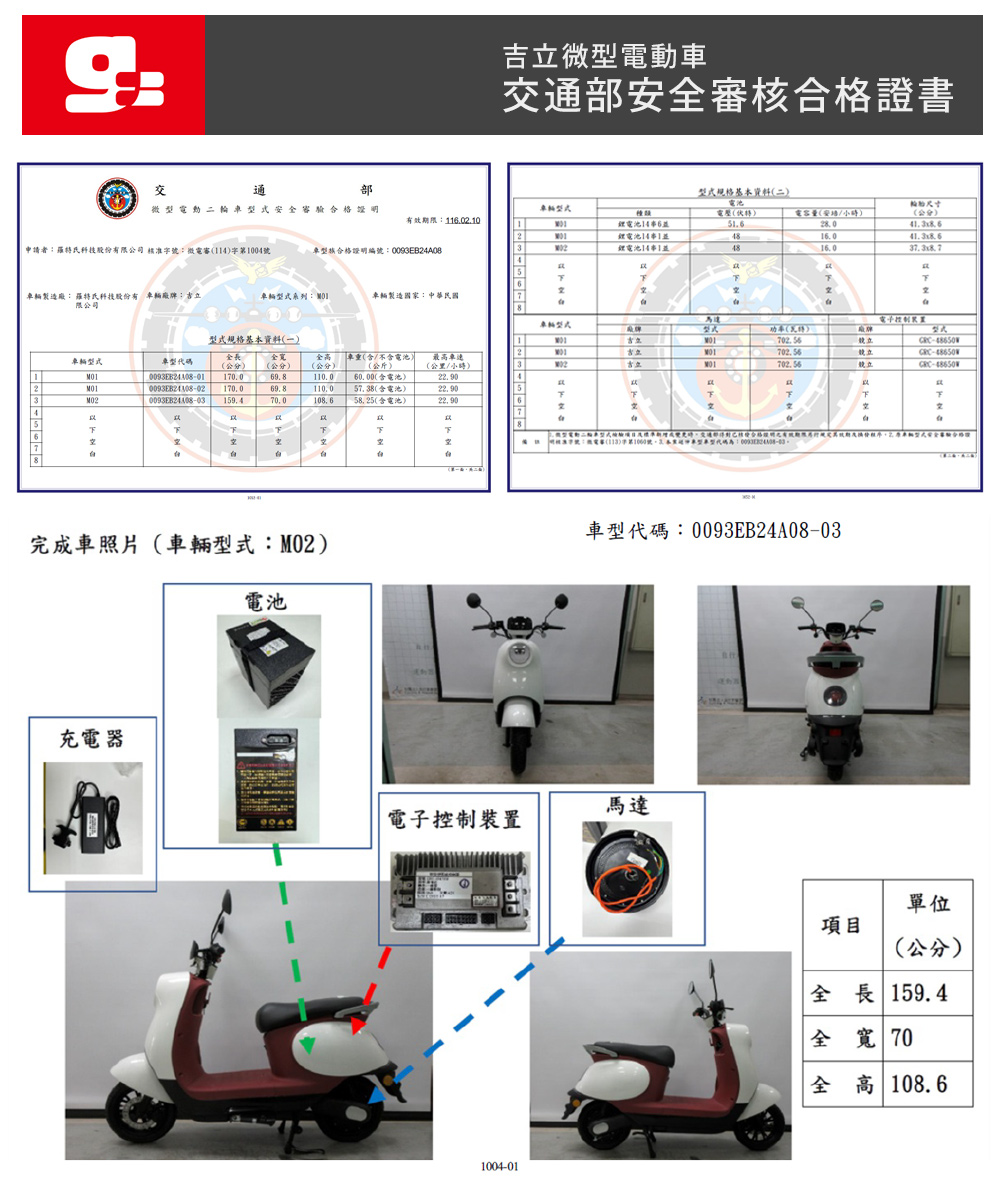 (車架)商品規格:車 型:Momi PEG-081車廠型號:吉立 M02車身尺寸:159.4*70*108.6 cm坐墊高度:71CM輪胎尺寸:90/70/10電池型式:鋰電池/台灣製造(工研院防爆專利配方)電池規格:48V16Ah使用電壓:110v-120v充電時間:4-6小時煞車系統:鼓剎系統及煞車斷電安全裝置控制系統:正弦波無刷變頻控制器馬達功率:1000W欠壓保護:有最高時速:不超過25km/h續航里程:約30~35km爬坡能力:約10%安全載重量:100kg定速巡航:有前/後方向燈:前有/後有備 註:續航力會隨著各種因素而變化,例如騎乘重量、坡度、路面情況等等,另外正常情況下電池會逐漸老化,也會影響續航力。(電池)商品規格電池類型:鋰電池(工研院防爆專利配方)BSMI證書號碼:CI458061760026號99識別號碼:R45176電池容量:16AH電池電壓:48V保固時間:2年保固(限本賣場)電池產地:台灣(有量科技製造)註1. 最高續航力為實驗室測試值,模擬55Kg載重於定速25Km下的最高行駛距離,實際續航力因載重條件、個人騎乘習慣、騎乘路況與天候狀況不同而有所差異。註2. 充電時間是電池從零電量至充飽電的耗時,實際充電時間視當時殘餘電力與充電功率大小而定。本商品標準配備:車體 X1保卡及說明書 X1鋰電池x1充電器X1(組)後視鏡X1(組)產品名稱:電動(輔助)自行車用二次鋰電池組Type(型號):ASP-52016Nominal Voltage(額定電壓):48VDCTypical Capacity(額定容量):16AhMax. Current(最大電流):30ACharging(充電):請使用指定的充電器CNS電池名稱:14CNi-Mn-CoP10/99/131製造年份/號碼:依電池上序號顯示製造者:有量科技股份有限公司地址:桃園市龜山區茶專路6號Caution注意:請勿任意丟棄並做好回收處理。請勿置入水中、勿靠近火源與勿自行維修拆解。請勿將電池短路、擠壓、落摔及穿刺。非使用說明書指定機器請勿使用。請勿自行將電池串、並聯使用。騎乘後請立即對電池組進行充電。保固適用地區:台灣本島所使用之本公司電動自行車。