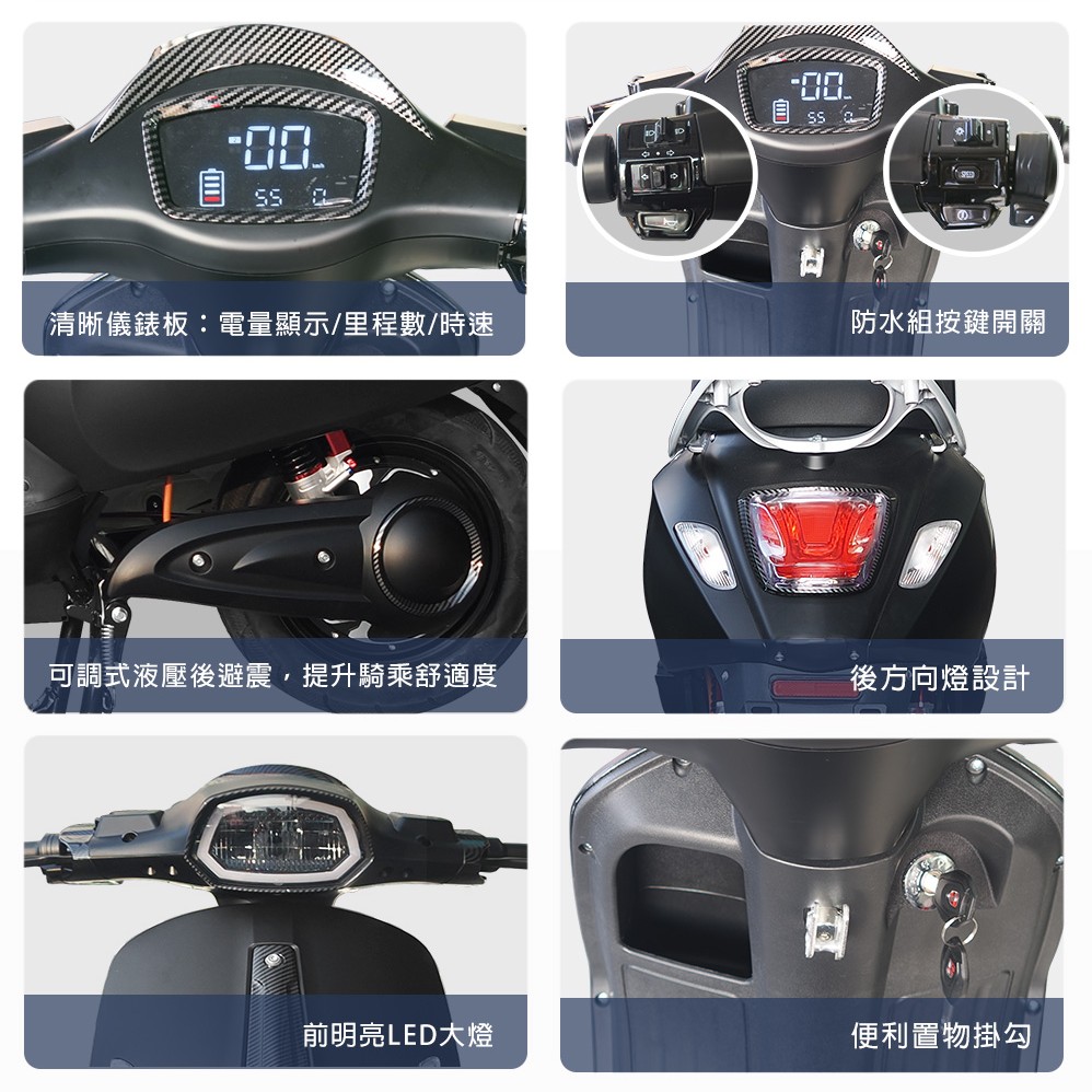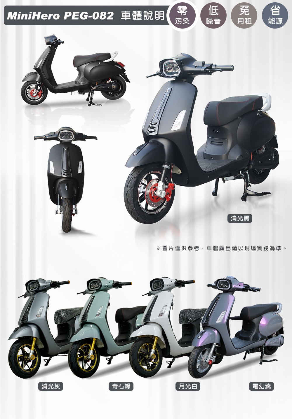 (車架)商品規格:車 型:Mini Hero PEG-082車廠型號:鑛達 小偉士車身尺寸: 168.8*70*109.7cm坐墊高度:69CM輪胎尺寸:3.00-10電池型式:鉛酸電池(不可提取)電池規格:48V20Ah(6個月保固)使用電壓:110v-120v充電時間:6-8小時煞車系統:前後碟剎系統及煞車斷電安全裝置控制系統:正弦波電控無刷輪轂馬達馬達功率:983.49W欠壓保護:有最高時速:不超過25km/h續航里程:約35~40km爬坡能力:約10%安全載重量:100kg定速巡航:有前/後方向燈:前有/後有備 註:續航力會隨著各種因素而變化,例如騎乘重量、坡度、路面情況等等,另外正常情況下電池會逐漸老化,也會影響續航力。(電池)商品規格:電池類型: 鉛酸電池(無法提取)識別號碼:R65387電池容量: 48V20AH電池電壓: 48V保固時間:6個月保固註1. 最高續航力為實驗室測試值,模擬55Kg載重於定速25Km下的最高行駛距離,實際續航力因載重條件、個人騎乘習慣、騎乘路況與天候狀況不同而有所差異。註2. 充電時間是電池從零電量至充飽電的耗時,實際充電時間視當時殘餘電力與充電功率大小而定。本商品標準配備:車體 X1保卡及說明書 X1鉛酸電池x1充電器X1後視鏡X1(組)Caution注意:請勿任意丟棄並做好回收處理。請勿置入水中、勿靠近火源與勿自行維修拆解。請勿將電池短路、擠壓、落摔及穿刺。非使用說明書指定機器請勿使用。請勿自行將電池串、並聯使用。騎乘後請立即對電池組進行充電。1年保固期保固內容:以本車所提供之品質保證書內容條款詳述,鉛酸電池保固半年(只限本賣場),車架、電機馬達、電子控制器、充電器、保固一年, 各項開關按鈕、轉把、喇叭、DC轉換器保固三個月,外殼塑件、燈泡、車胎、剎車皮屬消耗品無提供保固。 保固適用地區:台灣本島所使用之本公司電動自行車。