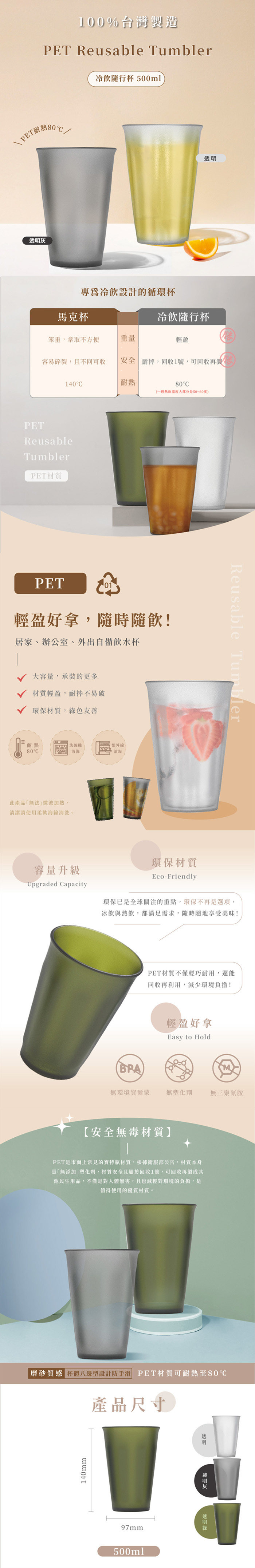 【商品規格】品名:冷飲隨行杯材質:PET耐熱溫度:80℃容量:500ml尺寸:口徑 97mm X 高 140mm產地:台灣有效期限:五年顏色:透明藍、透明綠、透明回收:回收標誌1號,屬於PET材質【產品使用注意事項】1. 本產品僅供食品接觸用途。2. 本產品可重複使用。3. 本產品使用PET,可耐溫至80度。4. 本產品符合循環經濟,可回收再製粒做工業循環使用。5. 本產品通過中華民國食品容器規範檢驗。1. 本產品非調理器具,請勿直接置於火源上。2. 請勿加熱空食器,不可微波、蒸煮食物。3. 淸潔時,請勿使用硬物、鋼刷或粗菜瓜布。【貼心提醒】🔸食器「不可」用於微波爐、電鍋。🔸商品顏色僅供參考,色樣會因電腦螢幕設定不同而有誤差,顏色以實際商品為主。