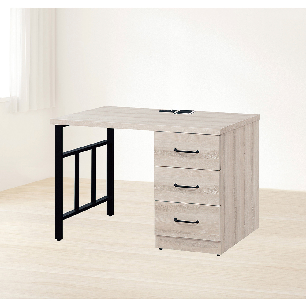 書桌設計:工業風混搭設計,木紋桌面搭配霧面黑金屬腳架,風格時尚且穩固耐用。桌面中央設有黑色USB兩用插座,方便充電。右側設有三層抽屜,提供充足的分類空間。多種風格選色:清新北歐感的橡木白、自然原木感的橡木色、沉穩內斂的灰橡色,都能完美融入不同的居家主題。