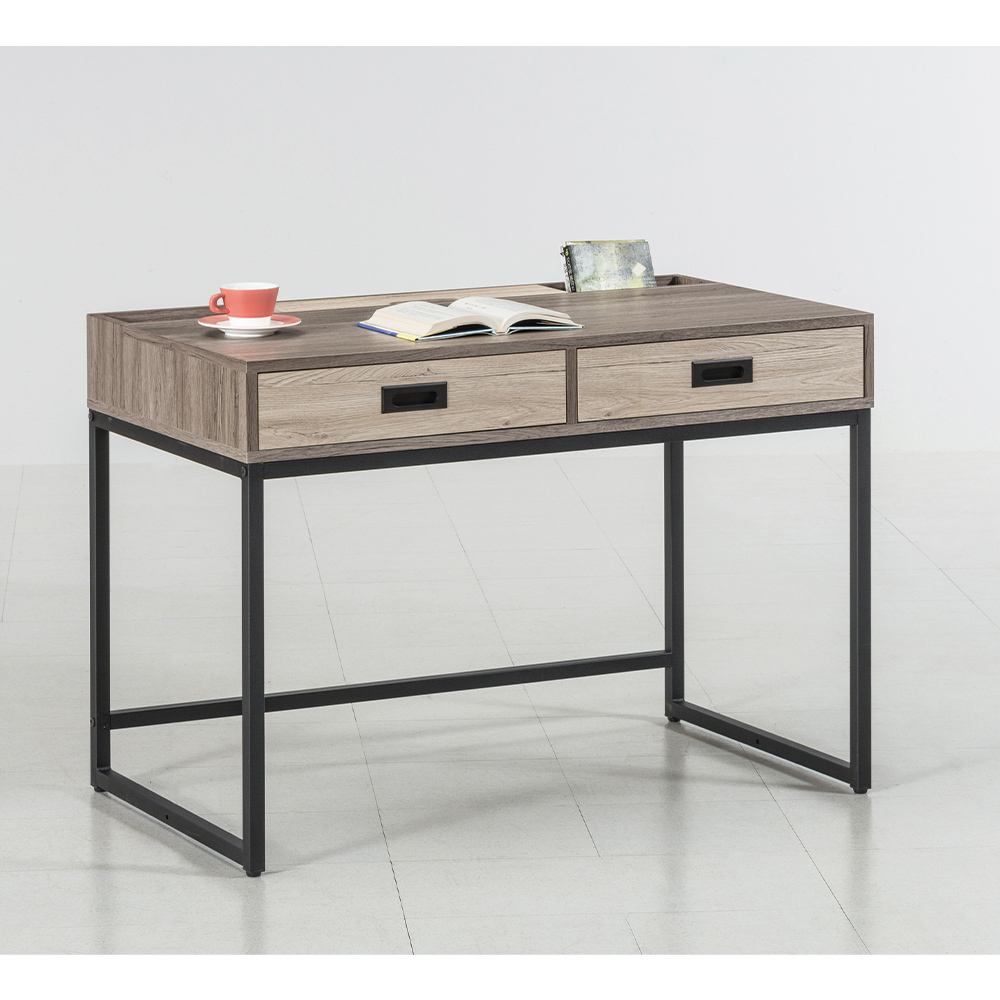 書桌設計:溫暖且富有層次的灰棕木紋,搭配俐落穩固的黑色金屬桌腳,形成了木質的溫潤感與金屬的剛硬感之間的對比,增添了現代層次感。