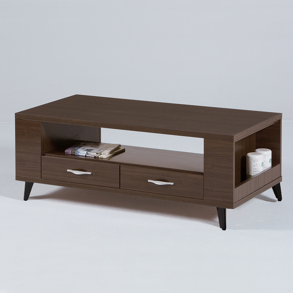 大茶几設計:胡桃木紋色調沉穩而內斂,線條俐落大方,搭配黑色錐形桌腳,強化了穩定性,讓厚實的櫃體不顯沉重,增添了輕盈感。抽屜搭配了簡約的銀色金屬長把手,為深色木紋點綴精緻的亮點。