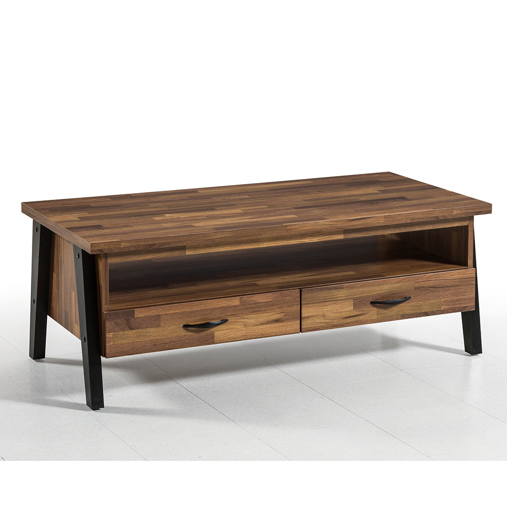 收納功能:寬敞的開放式置物層,適合隨手放置遙控器、雜誌或影音設備,方便快速取用;下方配置兩個抽屜,能將零散雜物、充電線材或私人用品隱藏收納,實現「開放展示」與「隱藏整潔」的完美結合。