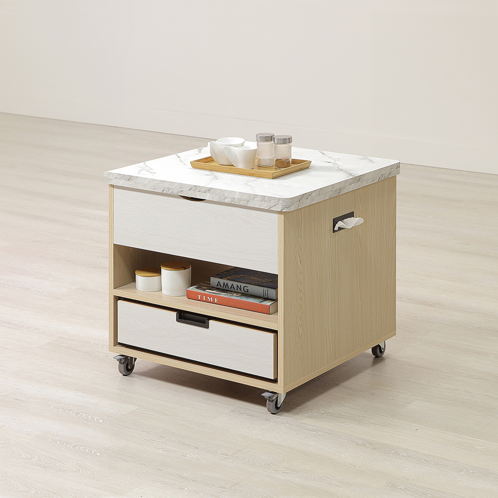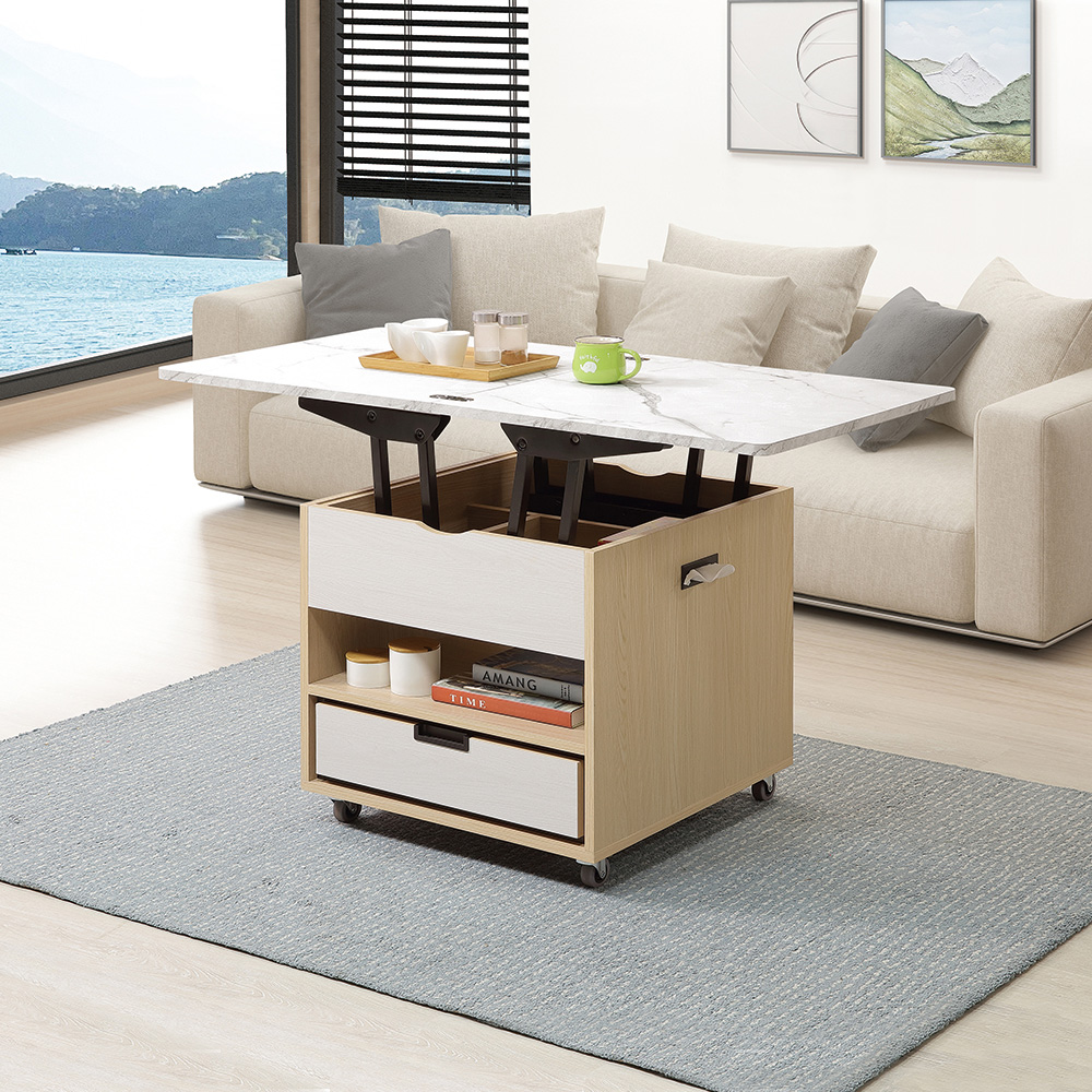 小茶几設計:方正俐落的線條,搭配溫暖的原木色木紋與清新的米白色,創造出和諧的北歐風格。可升降的仿石紋桌面,能輕鬆在低矮茶几與高桌間轉換,極大地拓展了用途。底部配置的滾輪,能隨心所欲地移動,充滿高度的靈活性與機能性。