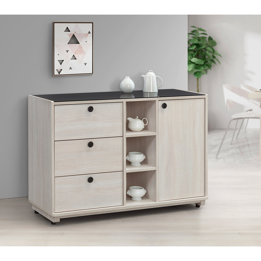 多樣化收納空間:黑色強化玻璃檯面適合放置咖啡機或裝飾,營造用餐儀式感;三層抽屜可以將廚房用品或其他物品妥善分類收納;中間開放空間適合擺放餐具或是常用物品;右側櫃門可以放置較大家電或是需要隱藏的物品,三種收納形式,讓每一件物品都有專屬空間。