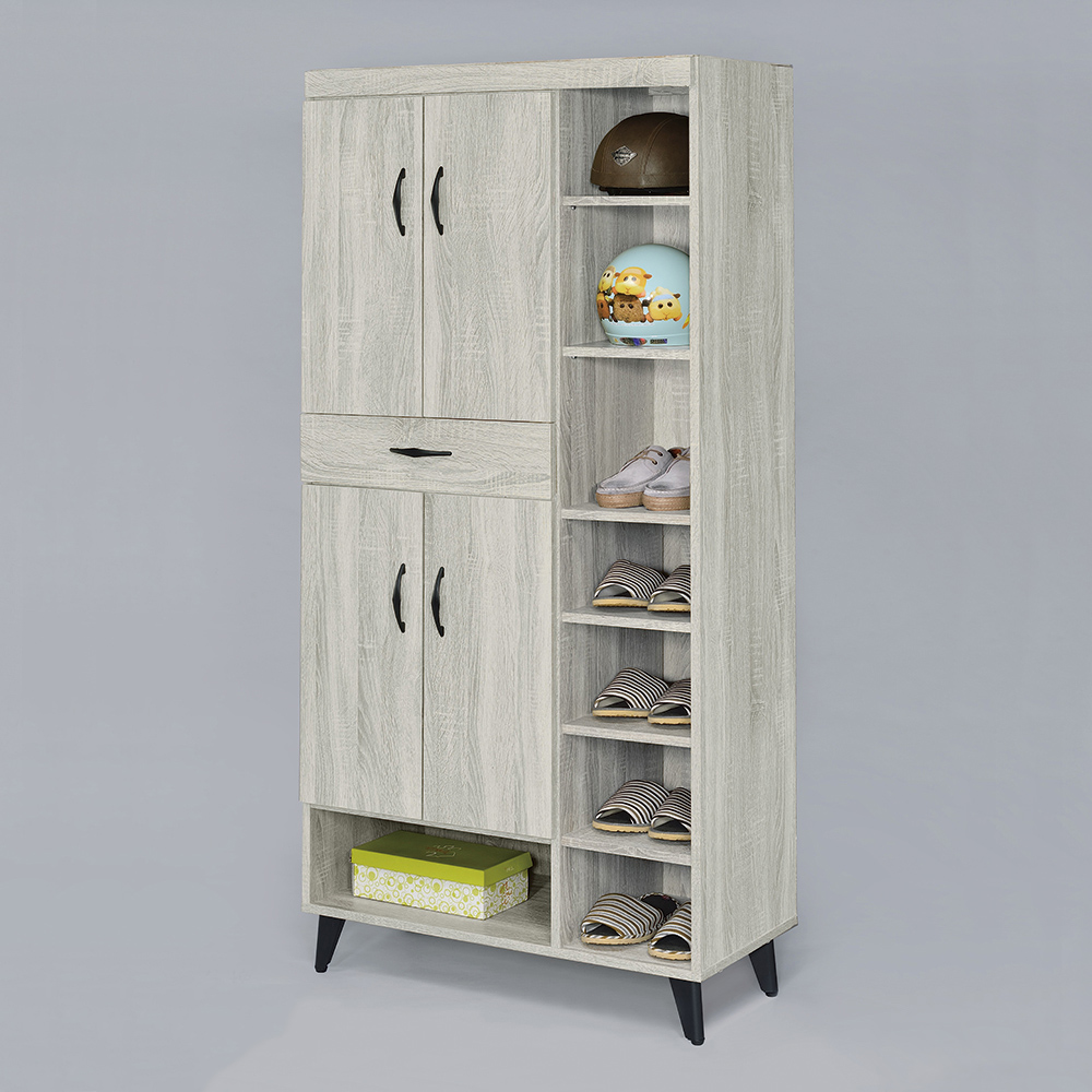 收納功能:結合上下兩組雙門櫃,可有效防塵並隱藏物品;中央抽屜層,方便快速拿取鑰匙、信件等零散小物;右側多層開放式空間,鞋款一目瞭然,換穿便利;底部開放層,能容納大型鞋盒或收納籃,實現高效且美觀的收納。
