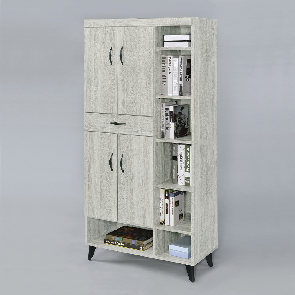 書櫃設計:以自然木紋理,搭配黑色錐形金屬腳柱和簡潔的黑色門把,營造出輕盈現代感。簡約直立式設計,線條俐落且結構紮實,有效節省空間。提供兩種木紋選擇:溫暖的橡木紋、清爽的炭白漂流木紋,能依照不同裝潢風格,選擇最能融入居家美學的理想色系。