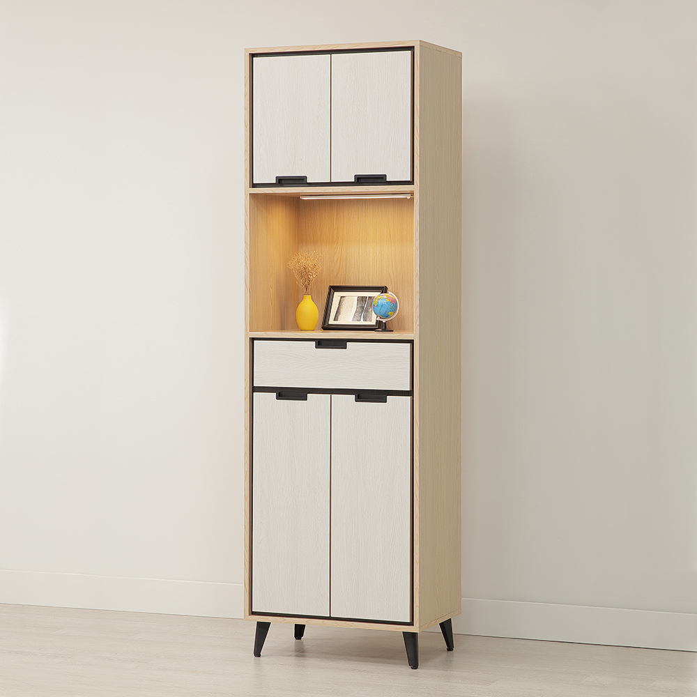 收納空間:頂部及下層設有雙門封閉空間,確保鞋物雜物完全隱藏;中段則配置抽屜收納零散小物,上方的暖光展示鏤空層則提供了兼具美觀與隨手放置功能的平台,實現全面的立體收納。