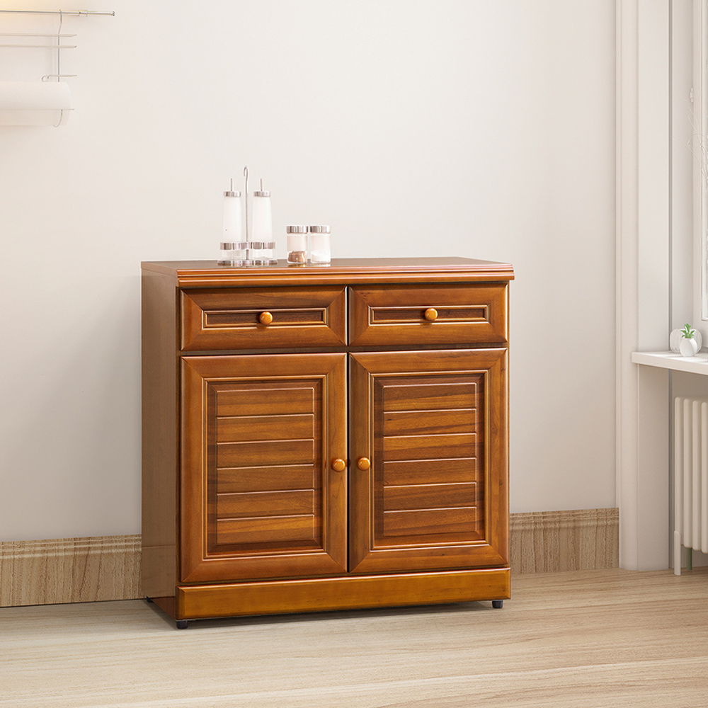 收納功能:上方配置兩個獨立抽屜,能將鑰匙、餐具等零碎小物分類存放;下方雙開門櫃位內部配置可調式隔板,無論是大型零食包裝或生活雜貨都能輕鬆歸位,讓每一次的拿取過程更加流暢順手。