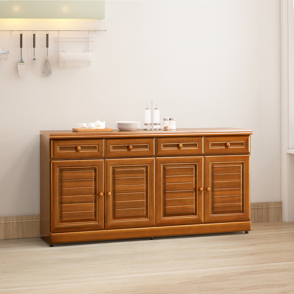 收納功能:上方配置四個獨立抽屜,適合收納餐具、生活備品等細碎雜物,讓取用更直接;下方四門儲物空間,內部設置靈活的可調式隔板,無論是大型鍋具、碗盤、罐裝飲品或是居家乾糧,都能找到最合適的歸屬,兼具分類與大容量的儲存需求。