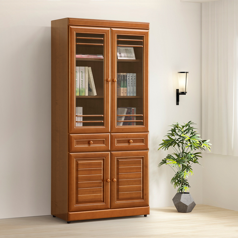 收納功能:上方配置玻璃門展示空間,內部設置可調式隔板,讓各類藏書與藝品一目了然且兼具防塵效果;雙抽屜空間,方便收納零散的文具與生活小物;下方則規劃隱藏式木門櫃,完美隱藏生活雜物。