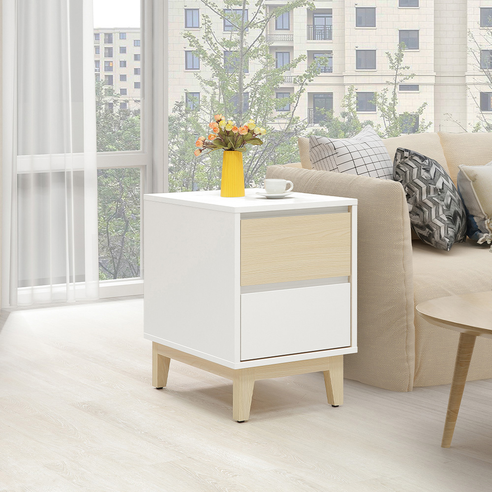 收納功能:配有雙層抽屜,上層可放置眼鏡、藥品等常用品,下層則適合收納書籍或私人物品;平整的檯面,可以放置檯燈、手機與水杯,讓所需的小物都能各就其位。