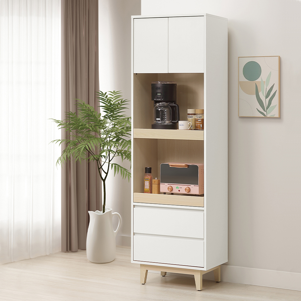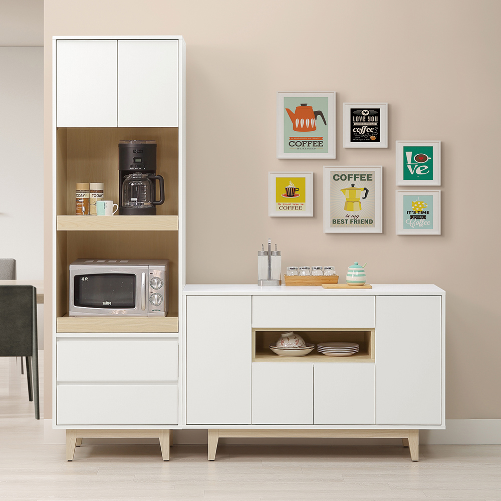 收納功能:設有專屬雙層電器托盤抽屜,適合擺放咖啡機、微波爐等常用家電,操作順手;上方雙門櫃與下方抽屜可收納零食、備品或不常用的餐具,保持空間整潔不凌亂。功能配置層次分明,滿足日常多元收納需求。