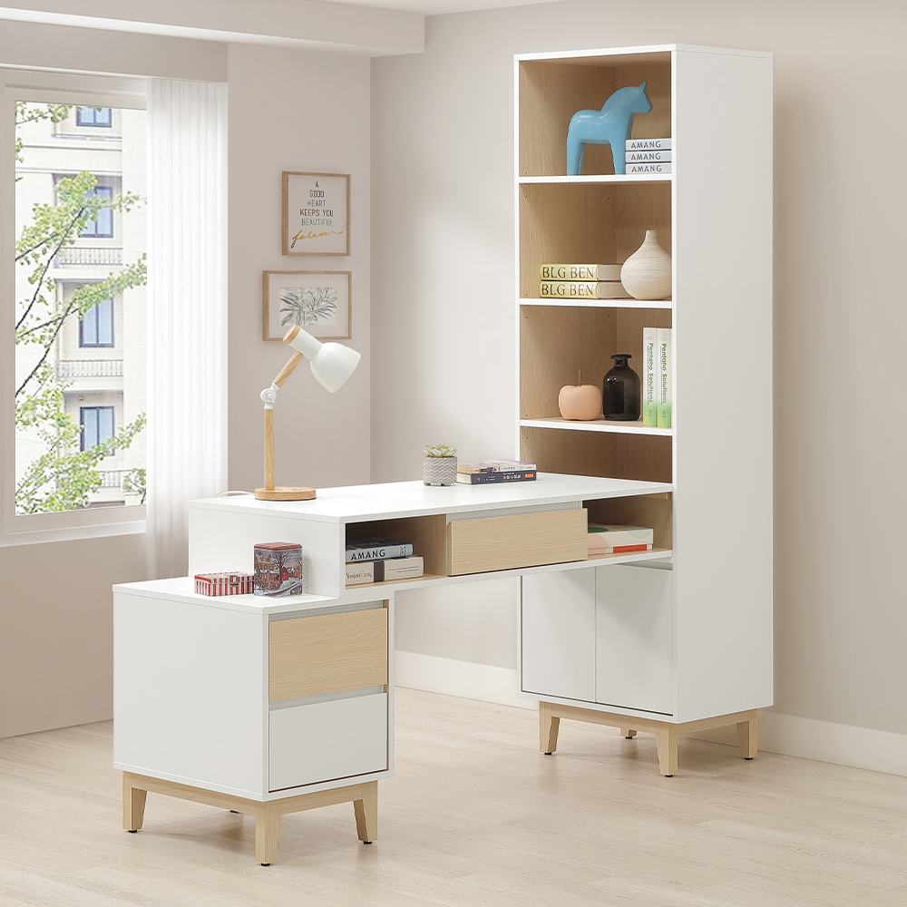 收納功能:四層開放式層格提供展示與取用空間,無論是日常閱讀的書籍、鬧鐘與文具都能一目瞭然;底部雙門櫃則能收納高大活頁夾、重要文件或各式雜物,能滿足多元的儲物需求。