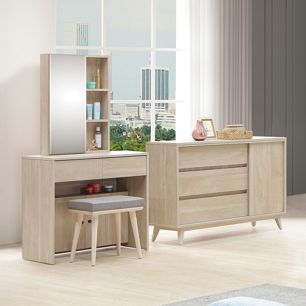 收納功能:收納櫃採三抽一門的分區設計,三層大容量抽屜方便分類收納日常小物或摺疊衣物;右側獨立門櫃內部高度充足,包包、文件或較高的家居備品都能輕鬆放好。上方檯面可作為置物平台,擺放花藝或香氛,為空間增添剛剛好的儀式感。