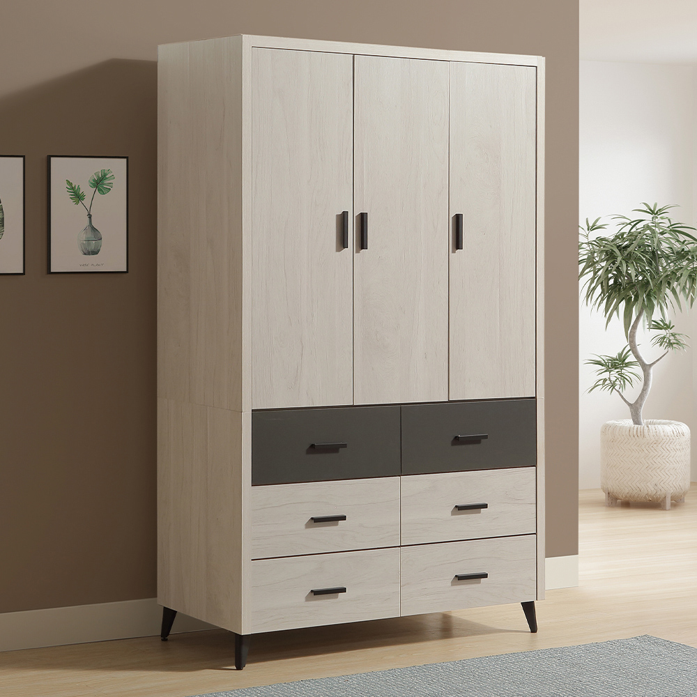 收納功能:以三門空間劃分,右側內部配置穩固掛衣桿,適合吊掛襯衫、大衣等易皺衣物;左側則規劃可拆式吊衣桿與活動層板,無論是摺疊衣物、包包或收納盒,都能依需求自由調整;下方六格抽屜,方便分類收納貼身衣物、配件與換季衣物,讓日常整理更有條理。
