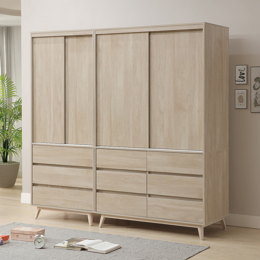 收納功能::上層以雙推門設計搭配左右獨立吊衣桿,能分區吊掛襯衫與大衣,衣物不易皺折、保持整齊;下方配置六格大容量抽屜,貼身衣物、圍巾與居家織品皆可分類清楚、取用便利,讓收納更有條理。