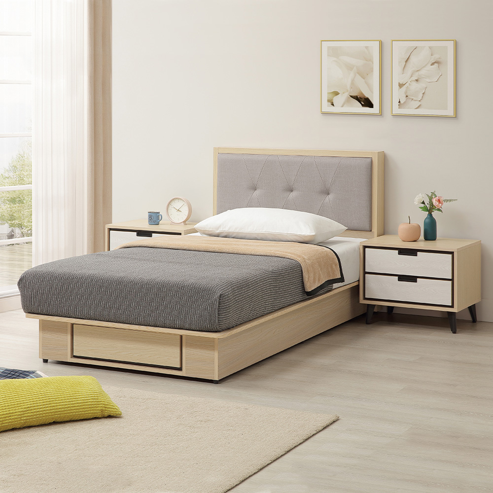 收納空間:三抽設計提供強大的床底隱藏式收納。環繞床體兩側,能有利用空間來分類儲存換季衣物、寢具和雜物,同時確保外觀的簡潔平整。