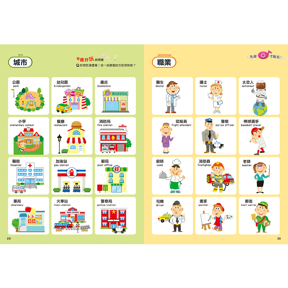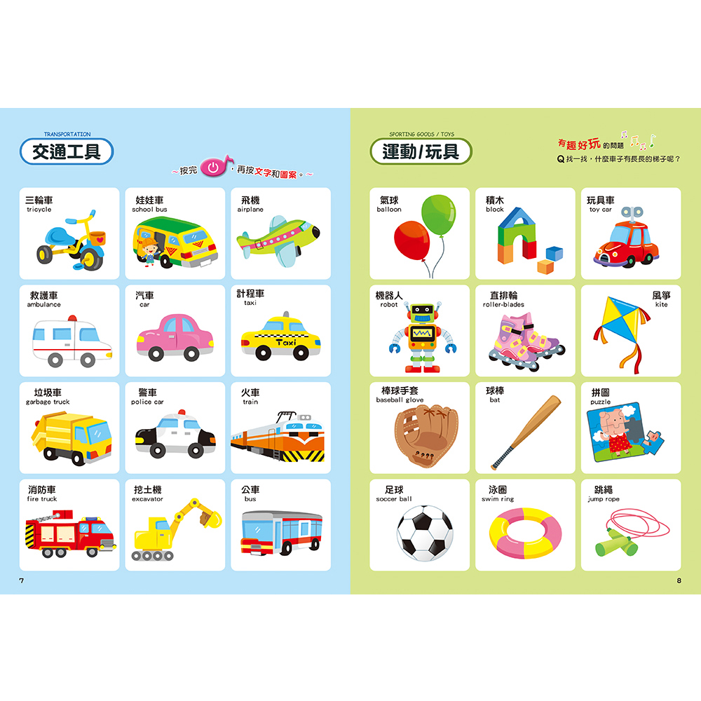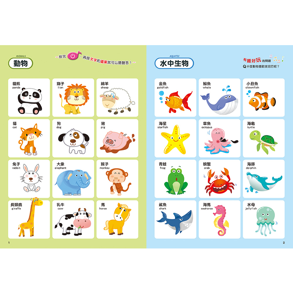 用「手指」點一下圖片或文字,就可以聽到單字發音;說完單字後,還會有一句簡單的敘述,可增進幼兒的認知廣度。「視覺+觸覺+聽覺」的多重感官學習方式,幼兒更容易吸收,學習效果更棒!
