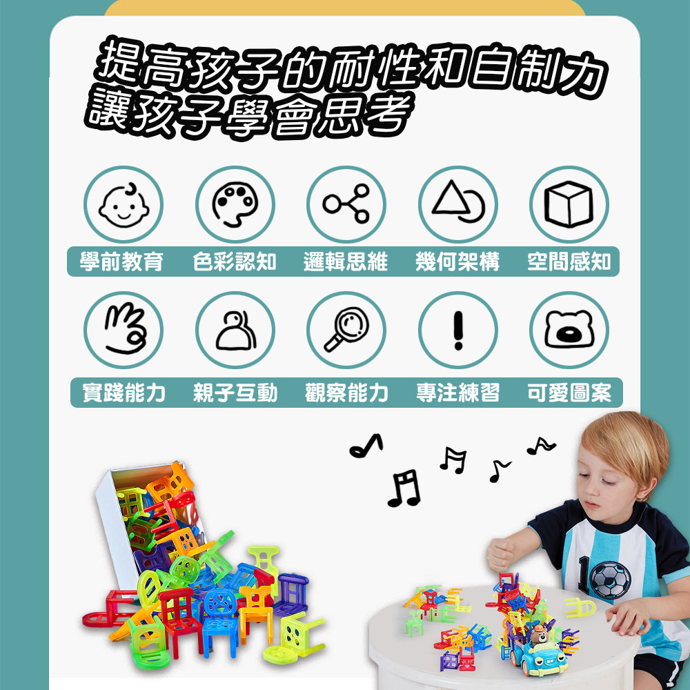 👉排排坐:限制排列方向的椅子疊疊樂,椅子平衡不坍塌就可繼續玩。