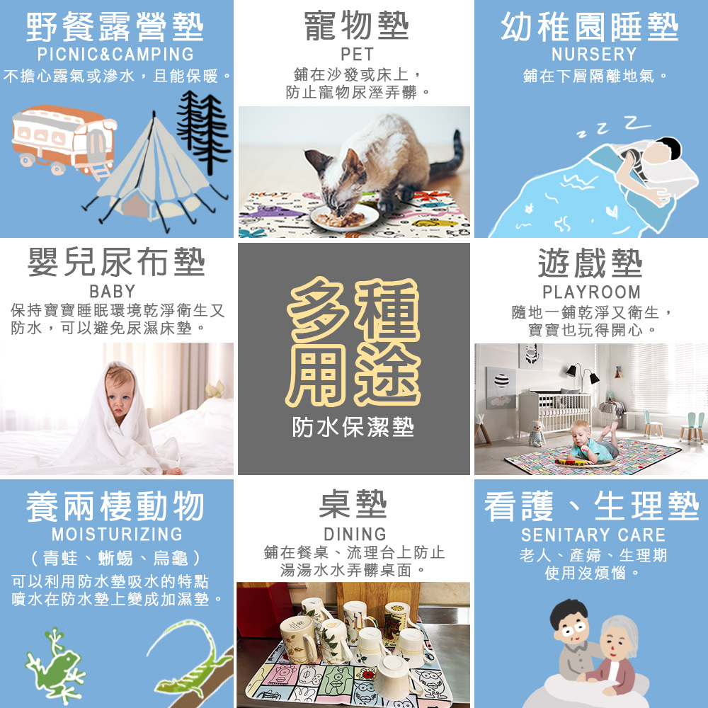 超防水:各種濕的髒的、水水糊糊滴滴答答的,啾愛你防水墊滿足各種隔水隔尿需求。