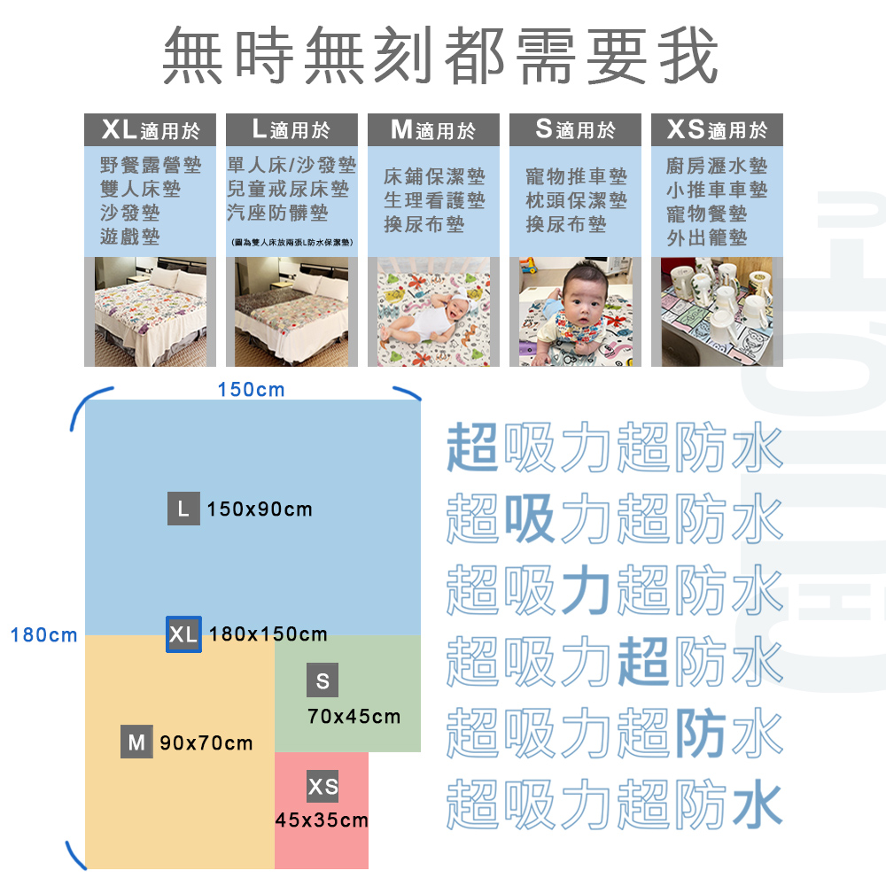 市面上所有防水墊都標榜防水透氣,但啾愛你防水墊的★五層超吸力設計★,使保潔效能遠優於其他產品。啾愛你防水保潔墊的吸水速度與吸水量,幾乎是棉質產品的兩倍!可徹底吸乾水分,保護下層家具,且材質不傷身體與皮膚,晾乾後也不會變硬,帶給您近乎完美的使用者體驗!
