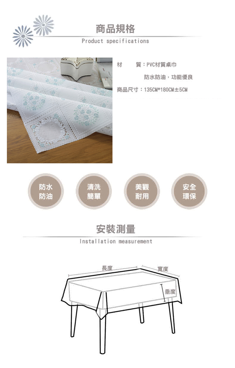 [喵到寶] 防水防油桌巾系列-長方桌會議桌135X180cm-白底小藍花