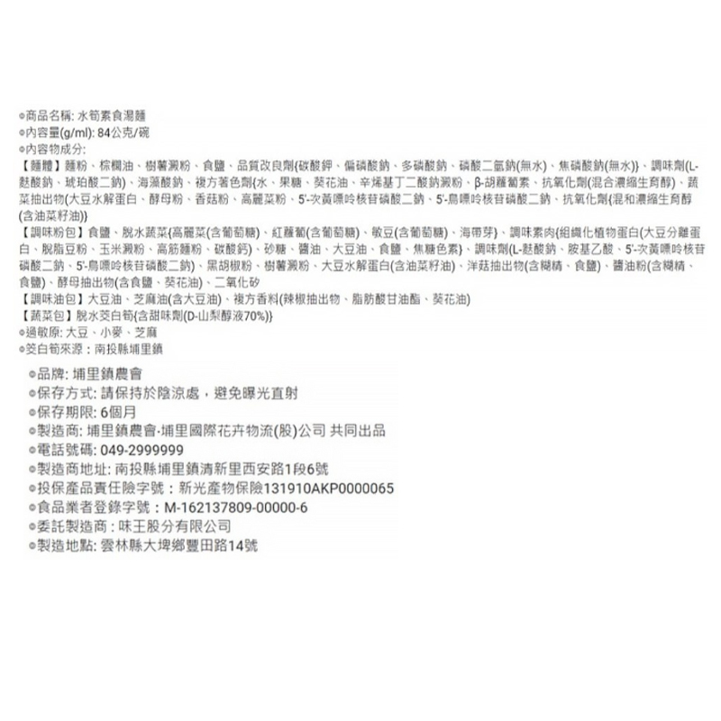 【麵體】麵粉·棕欄油、樹薯澱粉·食鹽,品質改良劑{碳酸鉀、偏磷酸鈉、多磷酸鈉、磷酸二氫鈉(無水),焦磷酸鈉(無水)}、調味劑(L-麩酸鈉、琥珀酸二鈉)、海藻酸鈉、複方著色劑{水、果糖、葵花油、辛烯基丁二酸鈉澱粉、β-胡蘿葡素、抗氧化劑(混合濃縮生育醇)、蔬菜抽出物(大豆水解蛋白、酵母粉、香菇粉、高麗菜粉、5'-次黃嘌呤核苷磷酸二鈉、5'-鳥嘌呤核苷磷酸二鈉,抗氧化劑(混和濃縮生育醇(含油菜籽油)} 【調味粉包】食鹽、脫水蔬菜{高麗菜(含葡萄糖)、紅蘿蔔(含葡萄糖)、敏豆(含葡萄糖)、海帶芽}、調味素肉(組織化植物蛋白(大豆分離蛋白、脫脂豆粉、玉米澱粉、高筋麵粉、碳酸鈣)、砂糖、醬油、大豆油、食鹽、焦糖色素}、調味劑(L-麩酸鈉·酸基乙酸·5'-次黃嘌呤核苷磷酸二鈉·5-烏嘌呤核苷磷酸二鈉)、黑胡椒粉、樹薯澱粉、大豆水解蛋白(含油菜籽油)、洋菇抽出物(含糊精、食鹽)、醬油粉(含糊精、食鹽)、酵母抽出物(含食鹽·葵花油)、二氧化矽 【調味油包】大豆油、芝麻油(含大豆油)、複方香料(辣椒抽出物、脂肪酸甘油酯、葵花油) 【蔬菜包】脫水菱白筍{含甜味劑(D-山梨醇液70%))