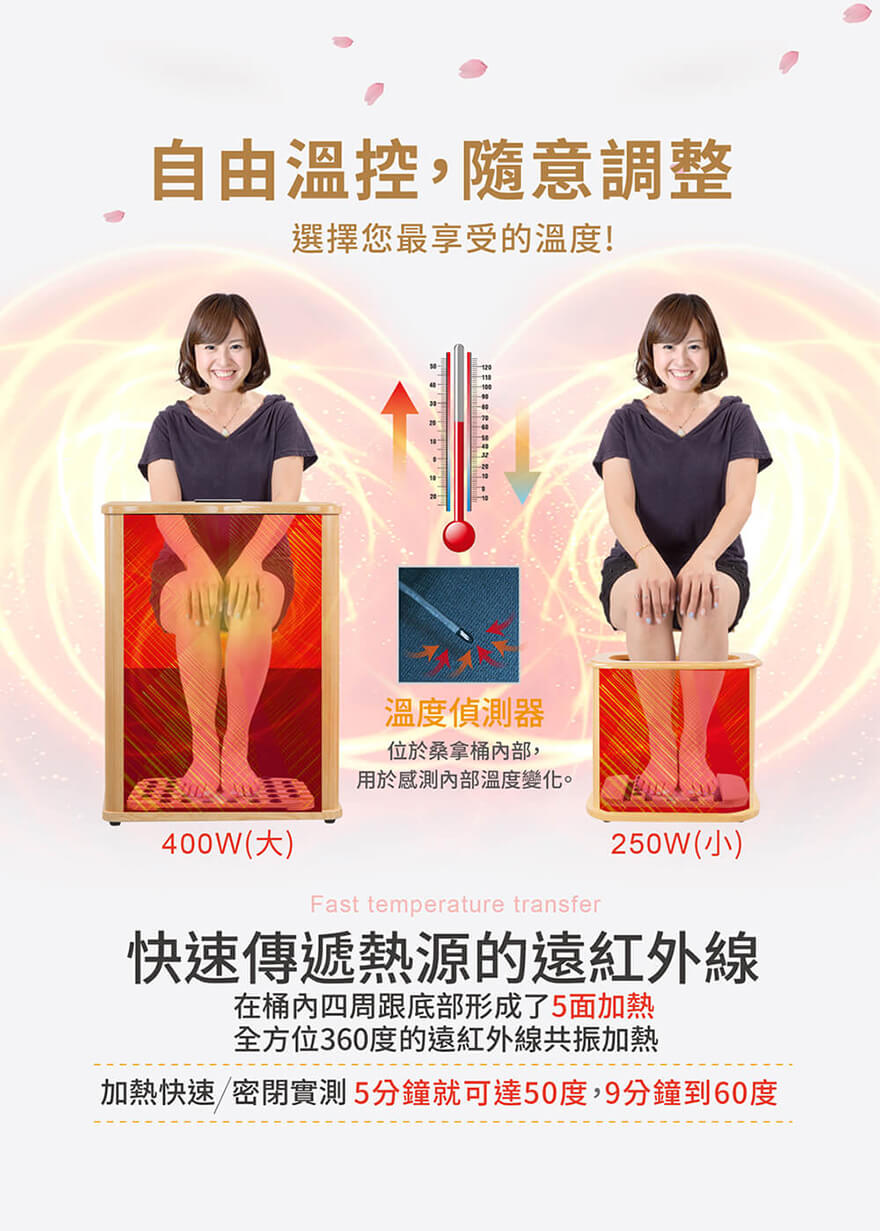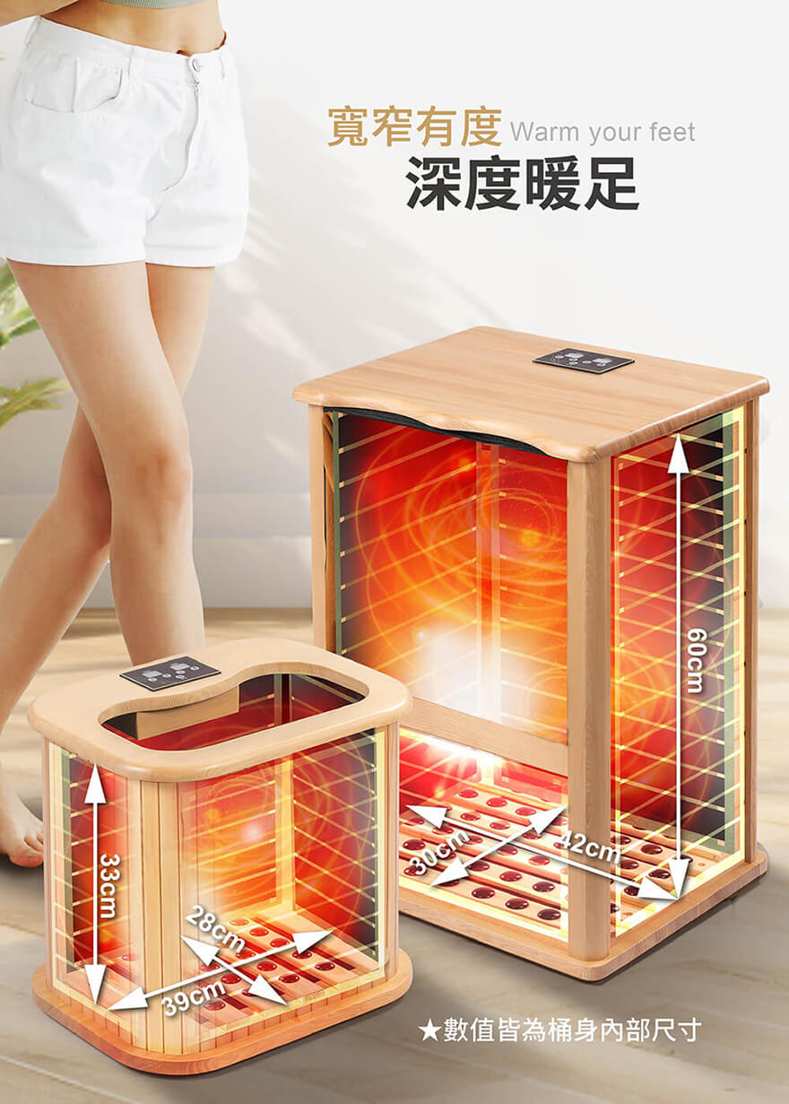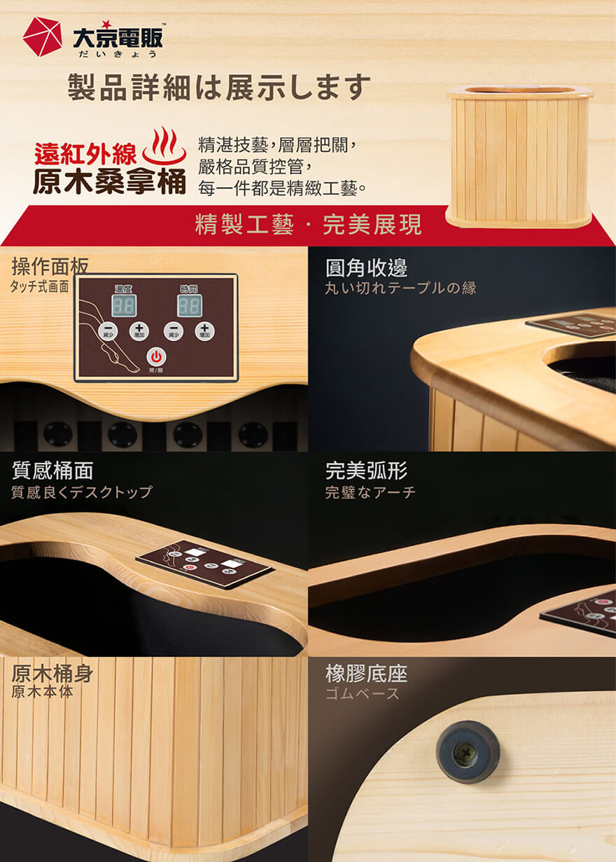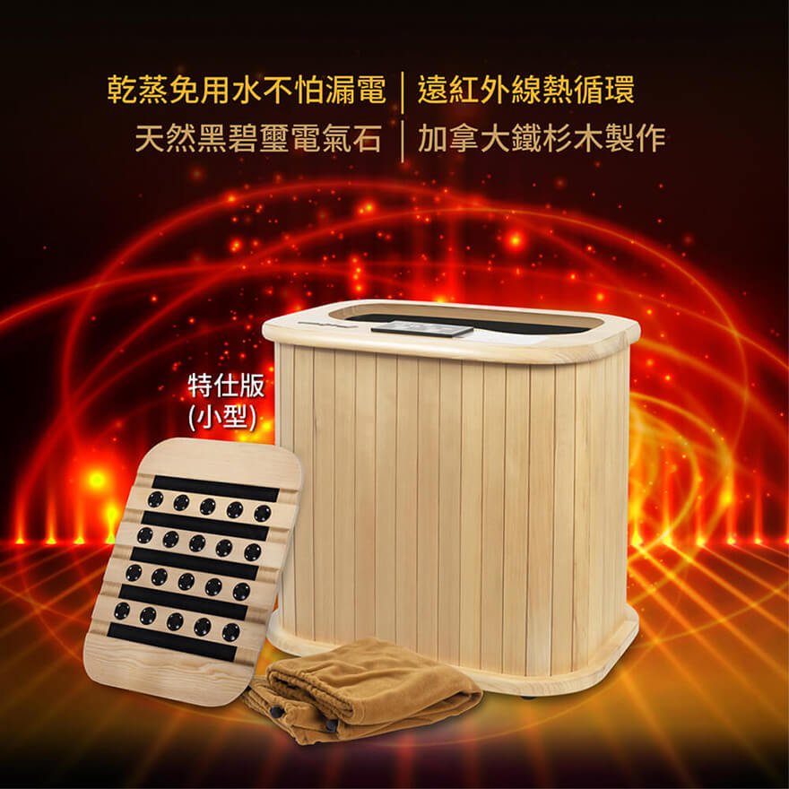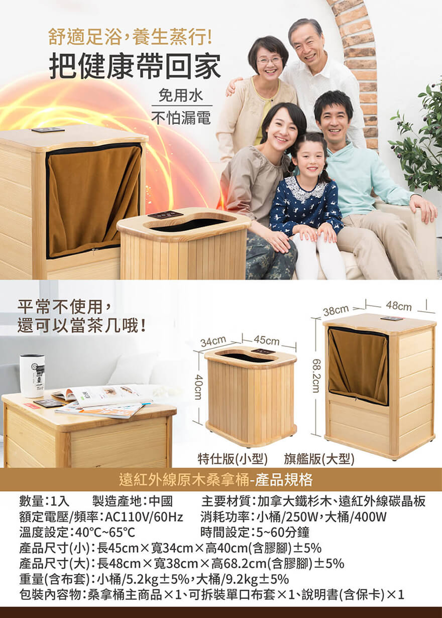 產品型號:BY010078A產品名稱:【大京電販】遠紅外線加熱原木桑拿桶-特仕版小型桶身:長45cm x 寬34cm x 高40cm ±5%可拆裝加長型布套:長59cm x 寬69cm±5%電源線:250cm±5%整機重量:5.2 Kg±5% (含可拆裝加長型布套)主要材質:加拿大鐵杉木+遠紅外線碳晶板使用電壓:AC 110V /60HZ消耗功率:250W商檢字號:R53615製造產地:中國 (台灣開發設計)包裝內容物:桑拿桶主商品x1 +可拆裝單口布套x1+說明書(含保卡)x1符合有下列所述時,請勿使用或是在專業醫師指導下使用:1、孕婦。2、使用中有胸悶、呼吸不順或其他不適症狀時,請立即停止使用。3、飯後30分鐘內。4、重傷初癒或剛開完刀,身體尚未復元。※ 請保持產品本體的乾燥,請勿在浴室或潮濕處使用;本產品請勿使用在頭部和傷口處。※ 鑑賞期內如需退換貨,商品本身、贈品、包裝彩盒均務必保持完整齊 。
