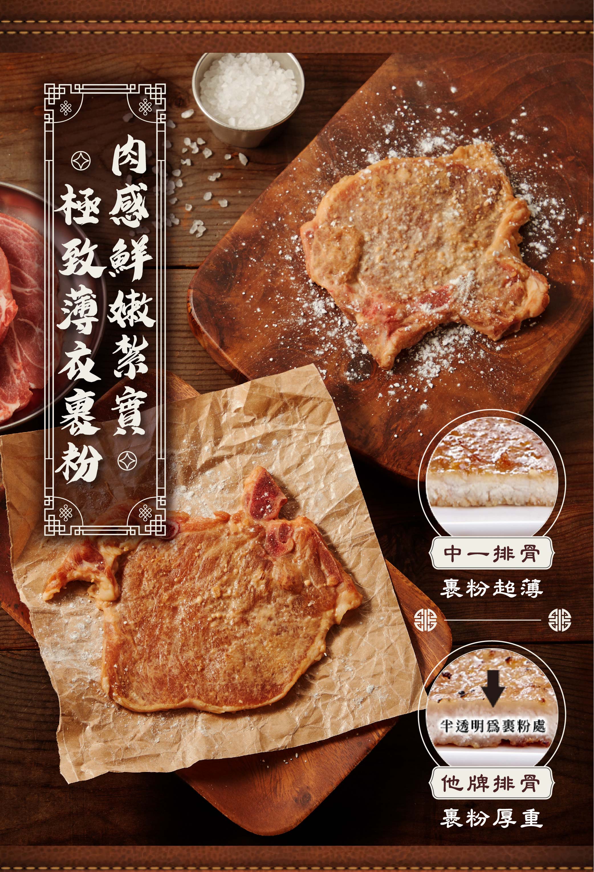 擁有老品牌的驕傲,大成「中一排骨」堅持提供最優質的豬排商品,絕不裏上厚重麵皮刻意增加豬排厚實感,以獨家工法用心製作出肉質鮮嫩、香氣撲鼻的產品。先細心拍打讓排骨鬆軟,再加入秘製醃料按摩入味,堅持不添加防腐劑或化學香精,超薄麵皮包覆住鮮嫩紮實的豬排,美味撲鼻讓人忍不住食指大動,大口咬下,厚實口感夾帶鮮甜肉汁在口中同時翻滾真是過癮,傳統實在的好滋味,您絕不能錯過!