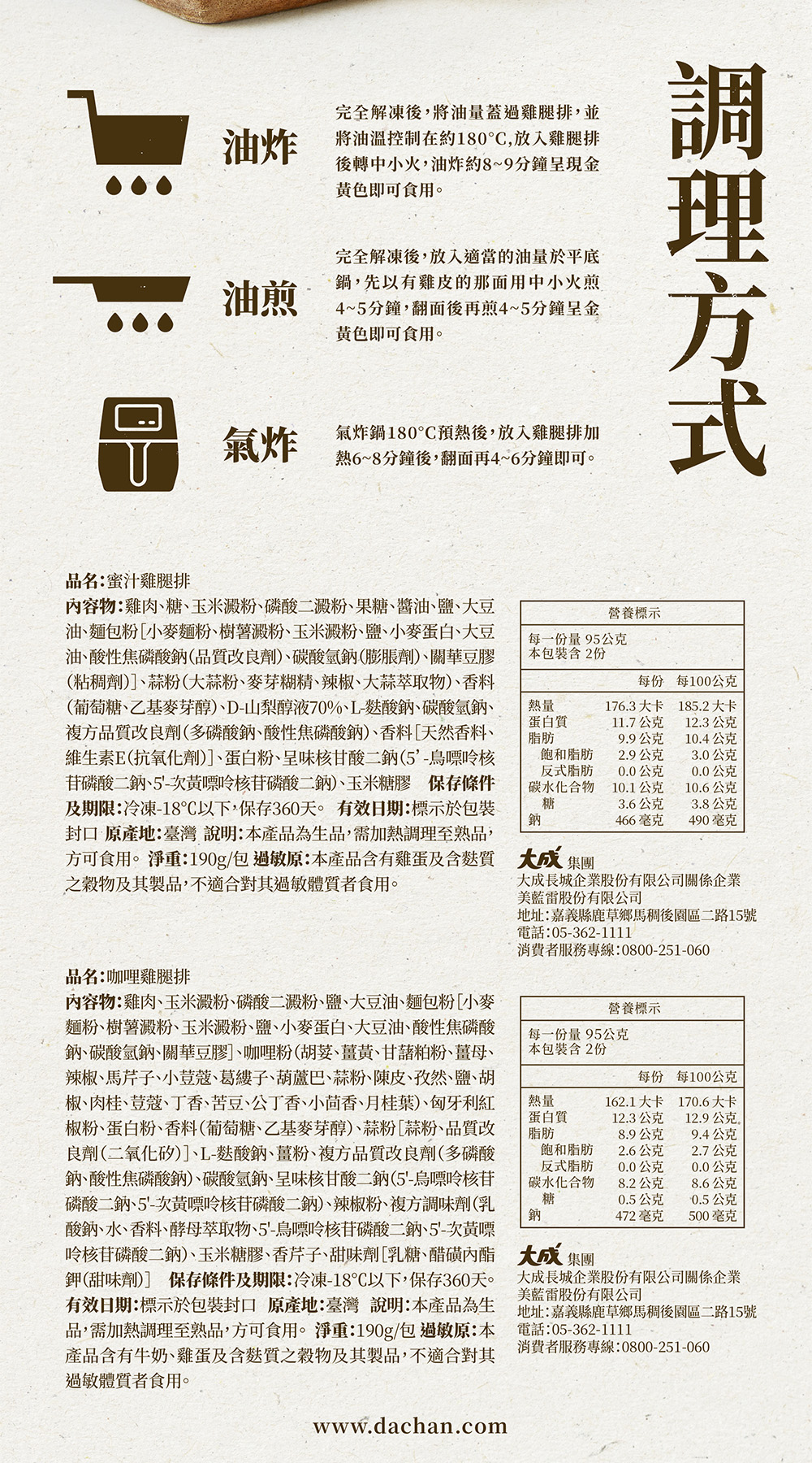 ▲內容物:雞肉、玉米澱粉、磷酸二澱粉、鹽、大豆油、麵包粉[小麥麵粉、樹薯澱粉、玉米澱粉、鹽、小麥蛋白、大豆油、酸性焦磷酸鈉、碳酸氫鈉、關華豆膠]、咖哩粉(胡荽、薑黃、甘藷粕粉、薑母、辣椒、馬芹子、小荳蔻、葛縷子、葫蘆巴、蒜粉、陳皮、孜然、鹽、胡椒、肉桂、荳蔻、丁香、苦豆、公丁香、小茴香、月桂葉)、匈牙利紅椒粉、蛋白粉、香料(葡萄糖、乙基麥芽醇)、蒜粉[蒜粉、品質改良劑(二氧化矽)]、L-麩酸鈉、薑粉、複方品質改良劑(多磷酸鈉、酸性焦磷酸鈉)、碳酸氫鈉、呈味核甘酸二鈉(5'-烏嘌呤核苷磷酸二鈉、5'-次黃嘌呤核苷磷酸二鈉)、辣椒粉、複方調味劑(乳酸鈉、水、香料、酵母萃取物、5'-鳥嘌呤核苷磷酸二鈉、5-次黃嘌呤核苷磷酸二鈉)、玉米糖膠、香芹子、甜味劑[乳糖、醋磺內酯鉀(甜味劑)]