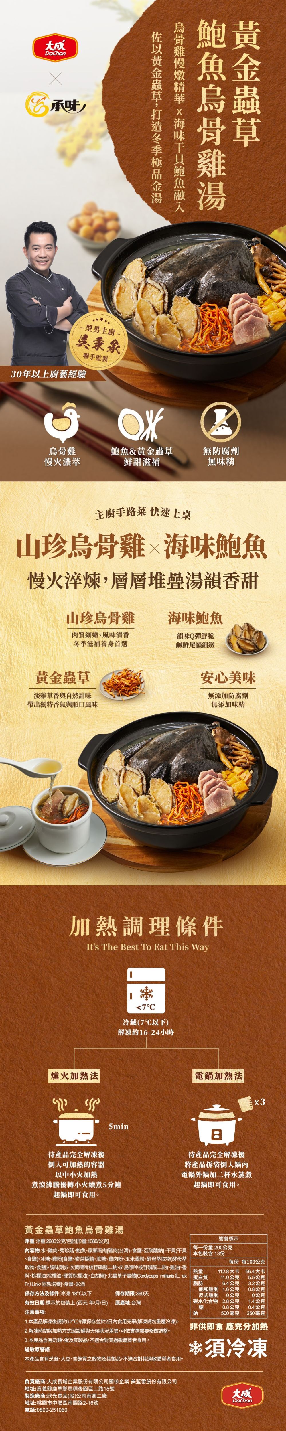 【大成食品】2026金馬年菜-★吳秉承★黃金蟲草鮑魚烏骨雞湯禮盒(2600g/組,固形量1080g)