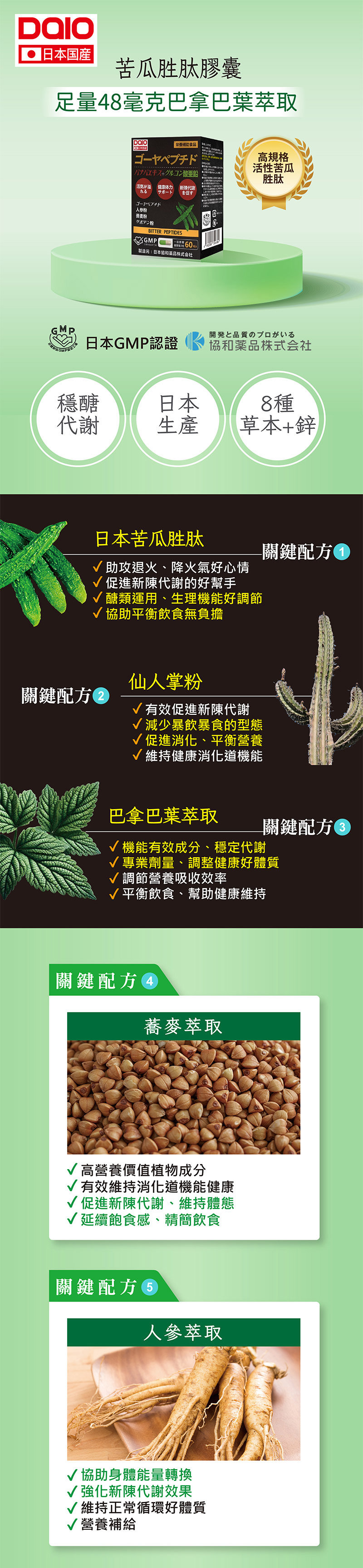 內容物名稱:仙人掌莖葉粉、微晶纖維素、明膠、苦瓜粉(含苦瓜胜肽)、仙楂果粉、人參粉、蕎麥粉、麥門冬粉、桑葉萃取物、乳糖、巴拿巴葉萃取物(含科羅索酸)、水、葡萄糖酸鋅、二氧化鈦、紅花黃色素、藍莓色素