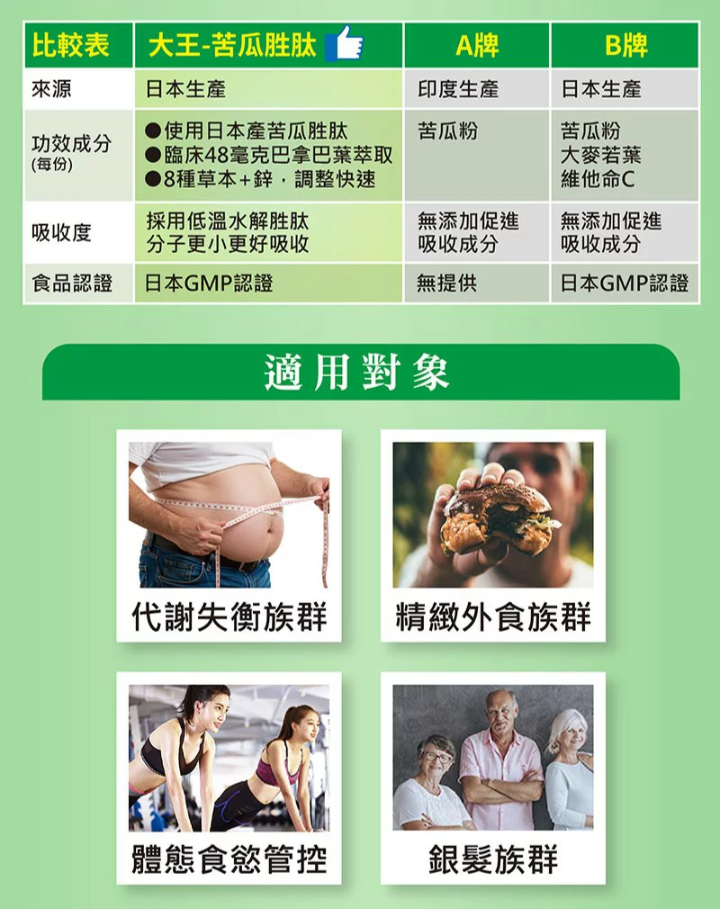 腸胃蠕動、體質調整幫助消化,可調節營養成分吸收度延續飽食感,促進新陳代謝內容物名稱:仙人掌莖葉粉、微晶纖維素、明膠、苦瓜粉(含苦瓜胜肽)、仙楂果粉、人參粉、蕎麥粉、麥門冬粉、桑葉萃取物、乳糖、巴拿巴葉萃取物(含科羅索酸)、水、葡萄糖酸鋅、二氧化鈦、紅花黃色素、藍莓色素食用方式:每日2粒,當作輔助食品,建議於餐後食用,效果最佳,請勿咀嚼以免破壞成分,多食無益。適用對象:一般成人、長期外食族、新陳代謝較差者、銀髮族。過敏原標示:本產品含有牛奶來源之原料。※ 製造日期與有效期限,商品成分與適用注意事項皆標示於包裝或產品中※ 本產品網頁因拍攝關係,圖檔略有差異,實際以廠商出貨為主※ 本產品圖片.文案若有變動差異,敬請參照實際到貨商品為準
