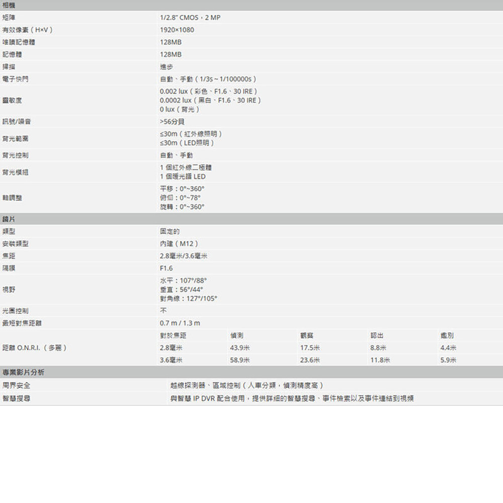 > 2 MP、1/2.8" CMOS 感光元件、高靈敏度、高解析度