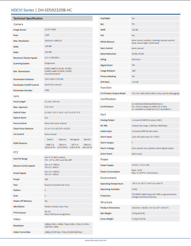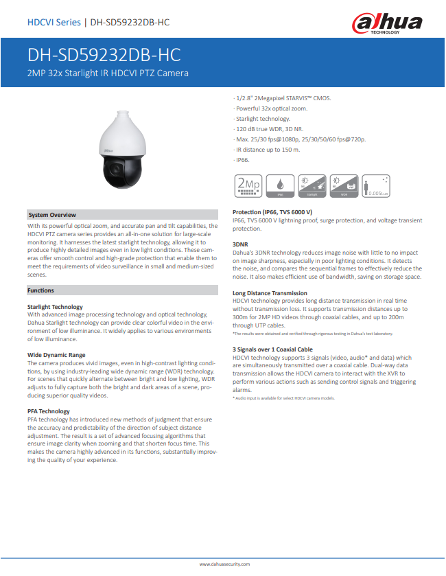 Long Distance Transmission:HDCVI 技術提供即時長距離傳輸,無傳輸損耗。 2MP 高清視訊透過同軸電纜傳輸距離可達 300 米,透過 UTP 電纜傳輸距離可達 200 公尺。