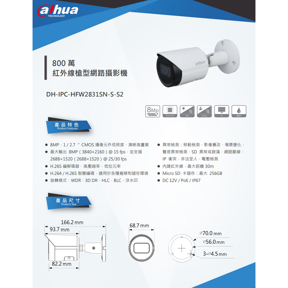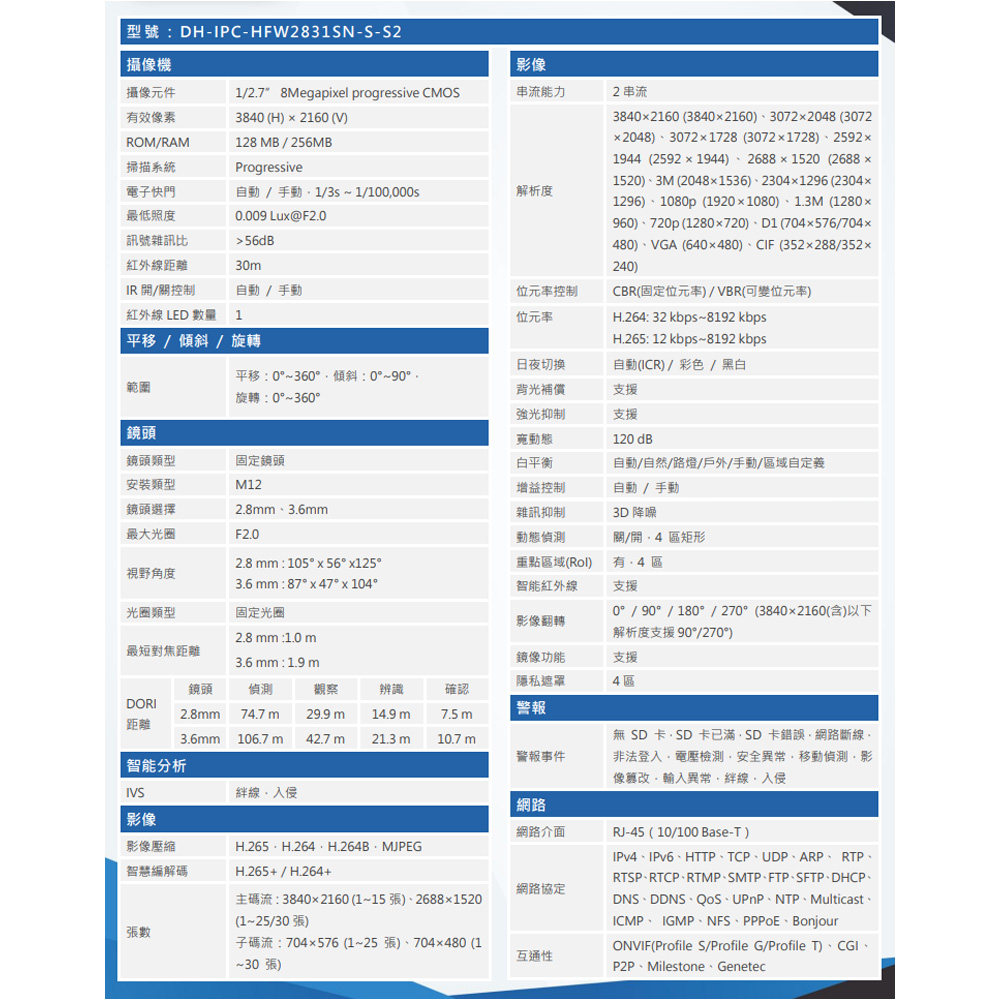 昌運監視器 大華 DH-IPC-HFW2831SN-S-S2 8MP槍型紅外線網路攝影機