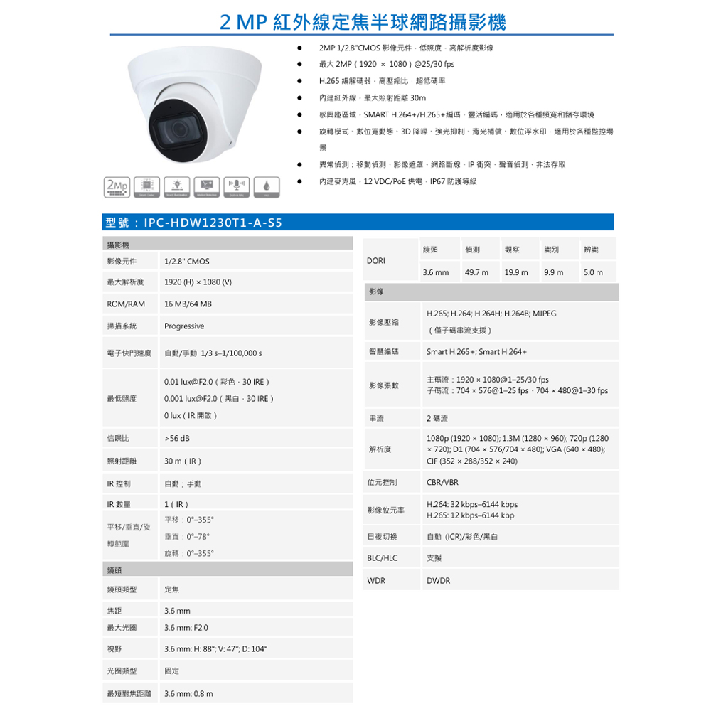 昌運監視器 大華 IPC-HDW1230T1-A-S5 2MP紅外線定焦半球網路攝影機 內建紅外線