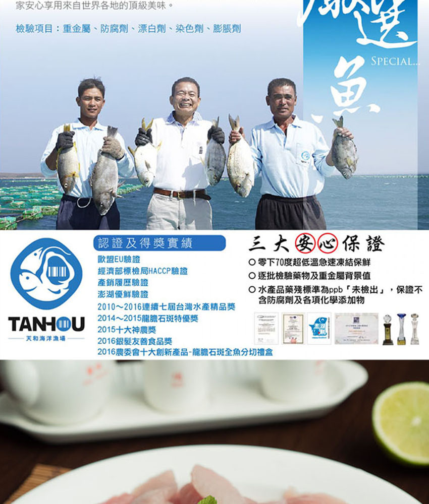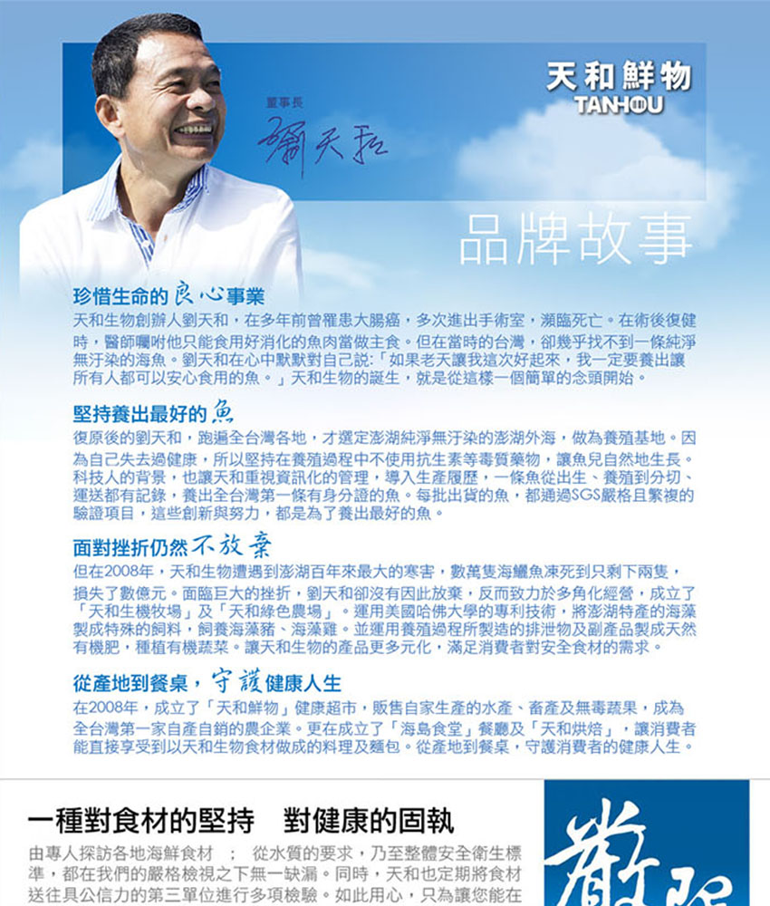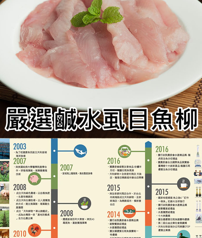 1.商品組合/規格:【天和鮮物】嚴選鹹水虱目魚柳10包〈300g/包〉2.商品品名:嚴選鹹水虱目魚柳3.商品重(容)量:300g/包4.內容物成分(如含有豬、牛成分請加註國別):虱目魚5.食品添加物名稱:無6.原產地(國):台灣7.製造廠商或國內負責廠商名稱:天和鮮物股份有限公司8.製造廠商或國內負責廠商地址:台北市忠孝東路五段689號8樓9.製造廠商或國內負責廠商電話:02-8785898610.以消費者收受日算起,至少距有效日期前?日以上:-18℃冷凍保存1年〈未開封〉開封後請儘早食用完畢11.食品業者登錄字號:X-180422045-00001-712.投保產品責任險字號:南山產物產品責任險0960-2236001303-04備註欄:為保持產品新鮮,請開封後儘早食用完畢
