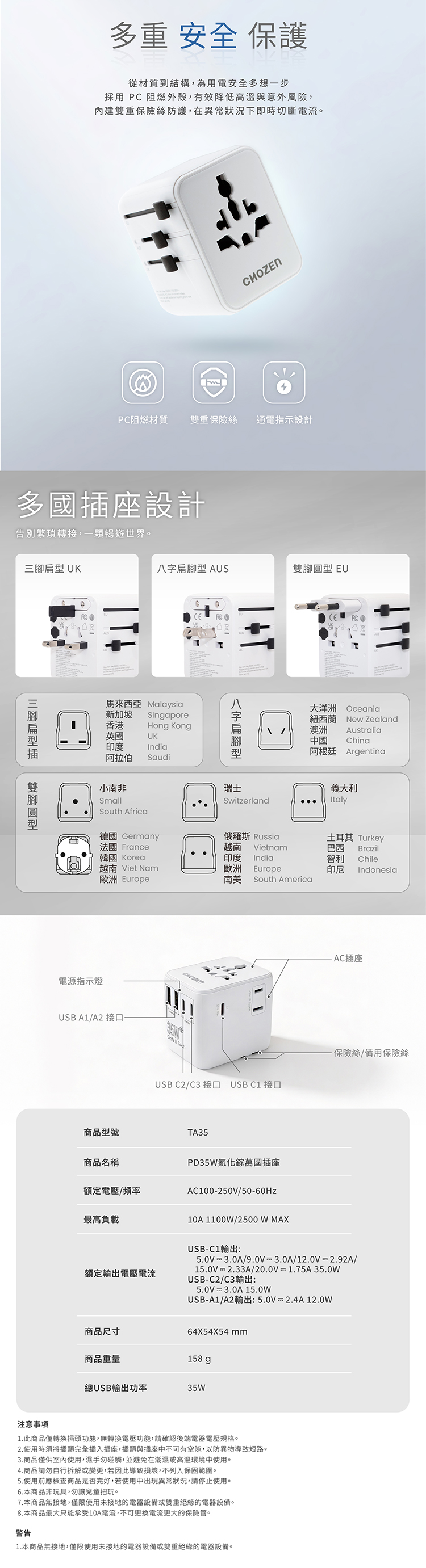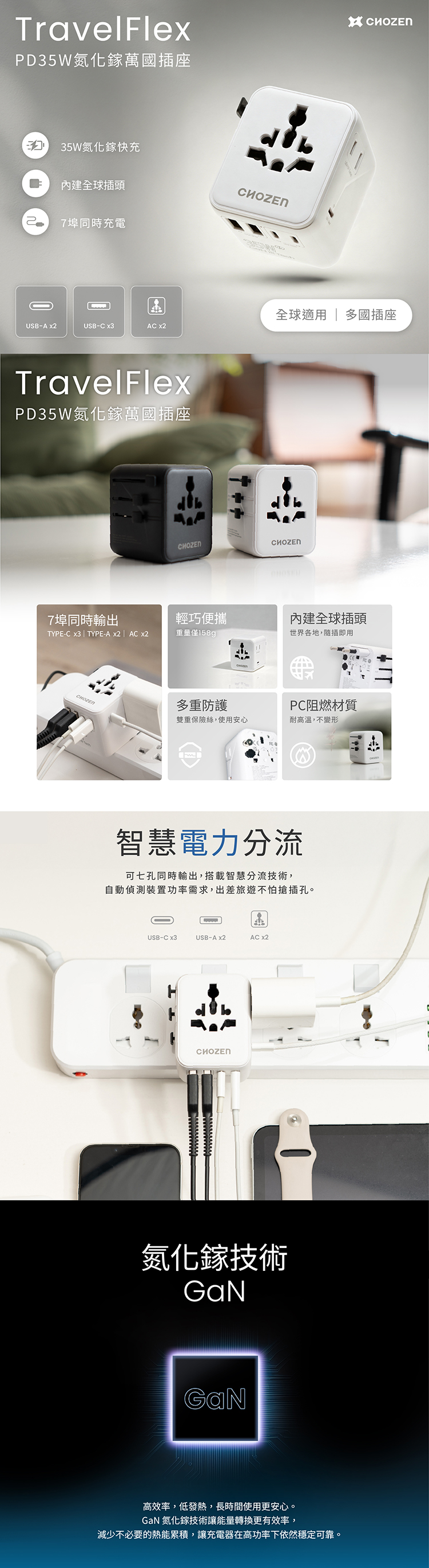 【CHOZEN】35W 氮化鎵 GaN PD 快充萬國插座|旅行充電器 全球通用轉接頭(宇宙黑)TA35B