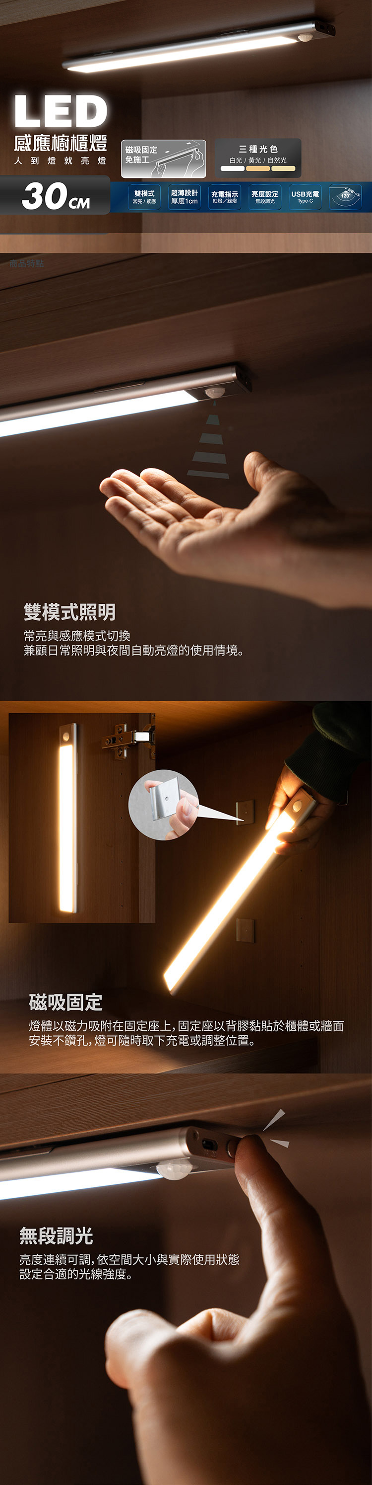【太星電工】LED人體感應櫥櫃燈(30cm) 超薄 磁吸安裝 USB充電 三色光 (智能感應 / 櫥櫃條燈/樓梯燈)